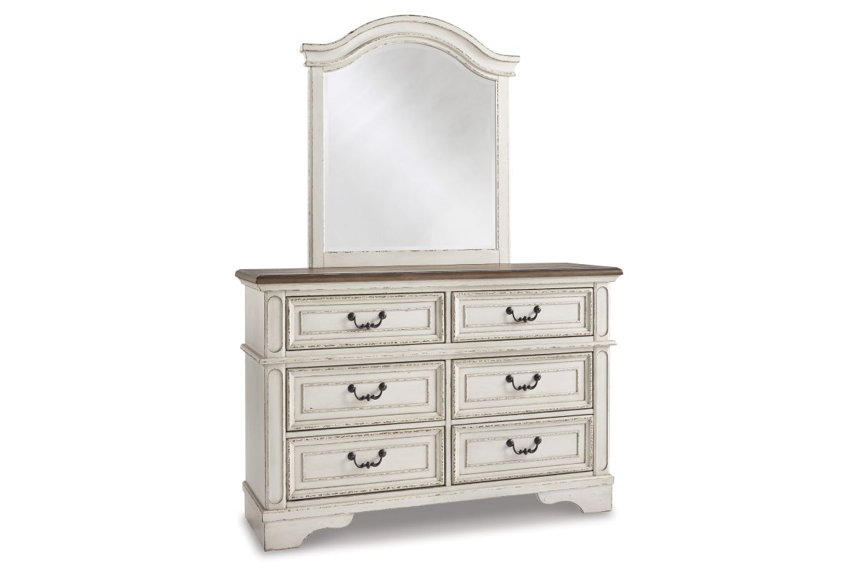 Elevating the art of traditional cottage styling, this dresser and mirror set is your dream bedroom retreat realized. This brilliantly crafted bedroom ensemble wows with dramatic scalloped details and an antiqued two-tone aesthetic, blending a chipped white with a distressed wood finished top for added charm. Framed drawer fronts and decorative corbels add refinement, while bail pulls in a dark bronze-tone finish lend a classic touch.