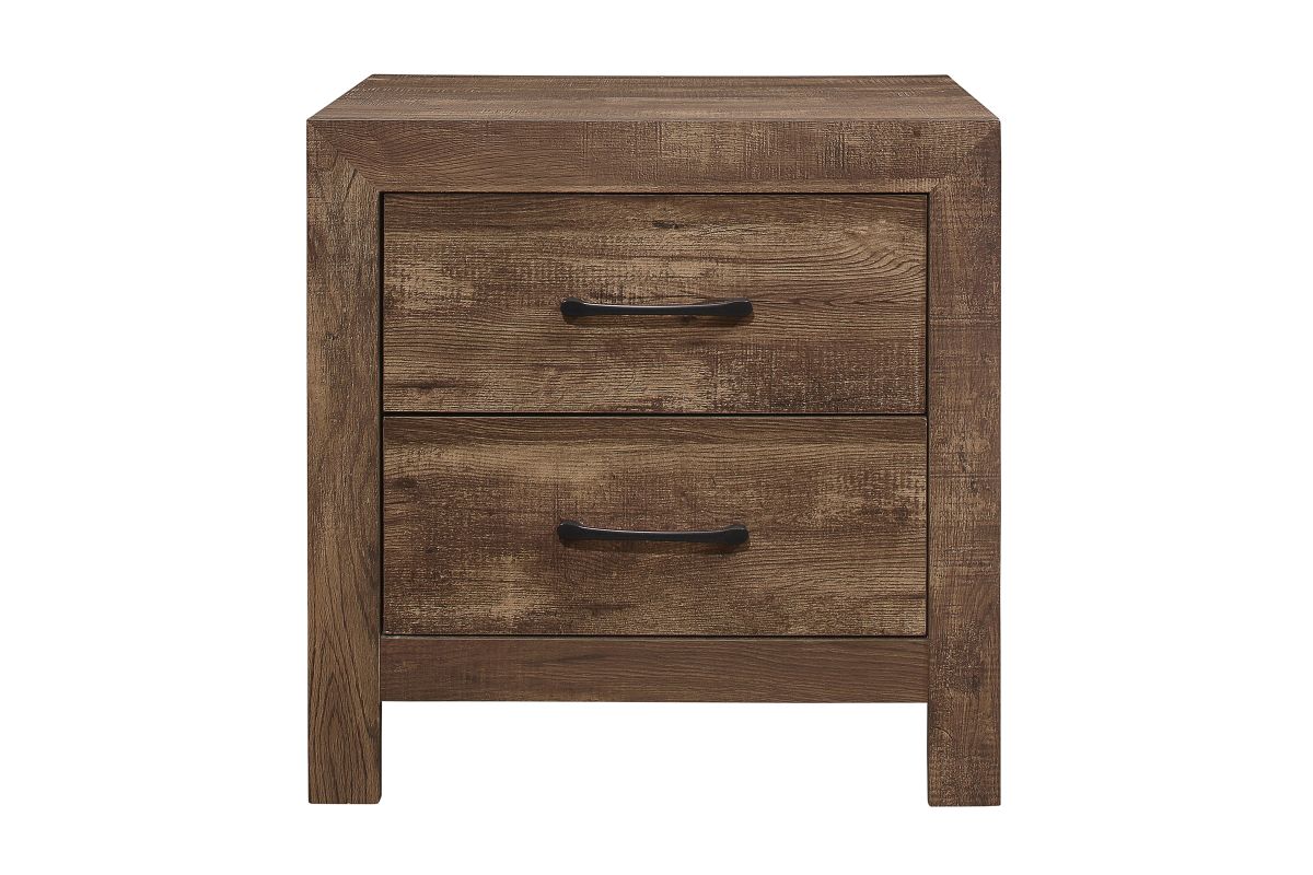 Modern lines and rustic styling are paired to create the look of the Corbin Collection. The 3D printed paper veneer's texture is highlighted by a brown finish for a realistic wood look. Providing complementing contrast, the drawer fronts of the nightstand feature black metal hardware. Subtle framing defines the profile of the nightstand, further lending to the unfettered design of the collection. No assembly required.