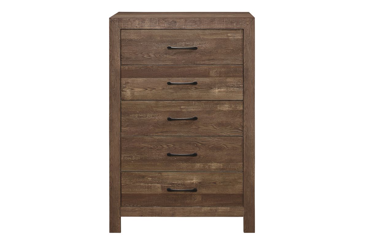 Modern lines and rustic styling are paired to create the look of the Corbin Collection. The 3D printed paper veneer's texture is highlighted by a brown finish for a realistic wood look. Providing complementing contrast, the drawer fronts of the chest feature black metal hardware. Subtle framing defines the profile of the chest, further lending to the unfettered design of the collection. No assembly required.