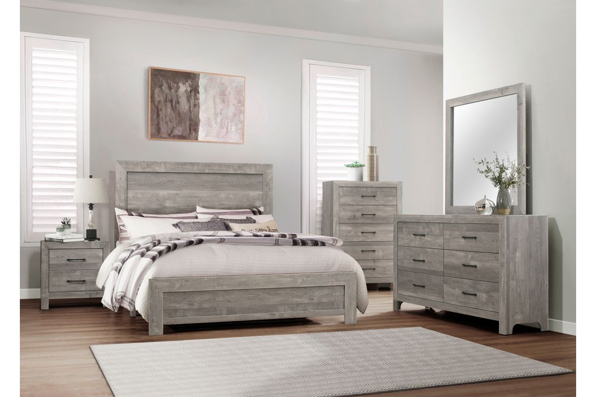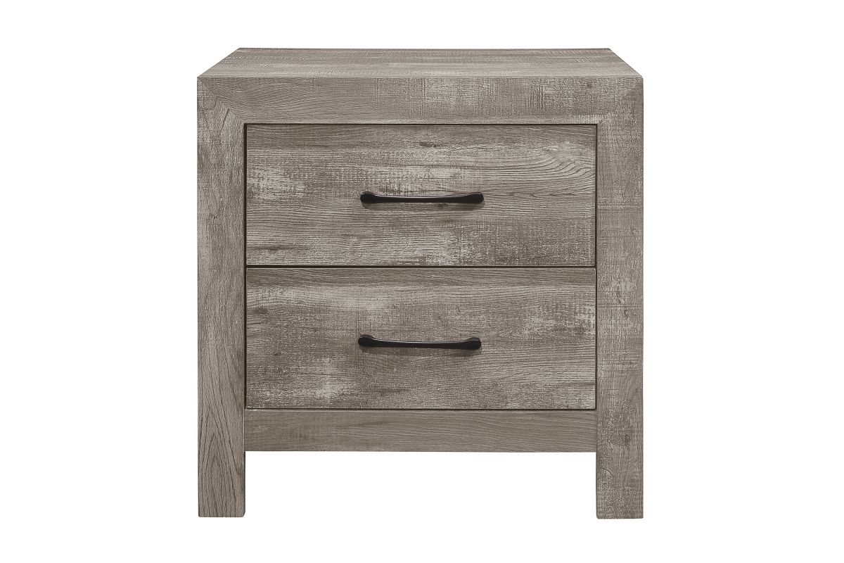 Modern lines and rustic styling are paired to create the look of the Corbin Collection. The 3D printed paper veneer's texture is highlighted by a gray finish for a realistic wood look. Providing complementing contrast, the drawer fronts of the nightstand feature black metal hardware. Subtle framing defines the profile of the nightstand, further lending to the unfettered design of the collection. No assembly required.