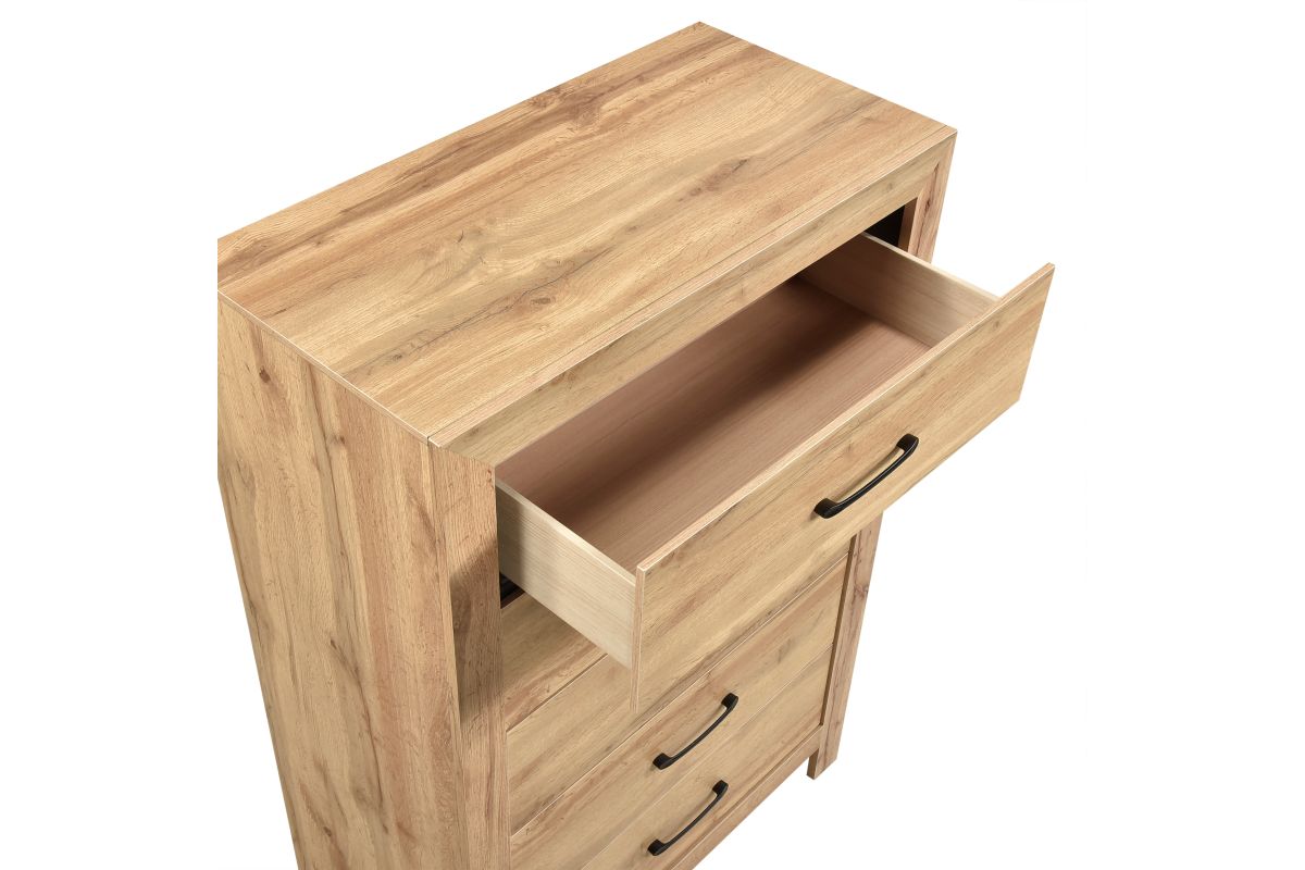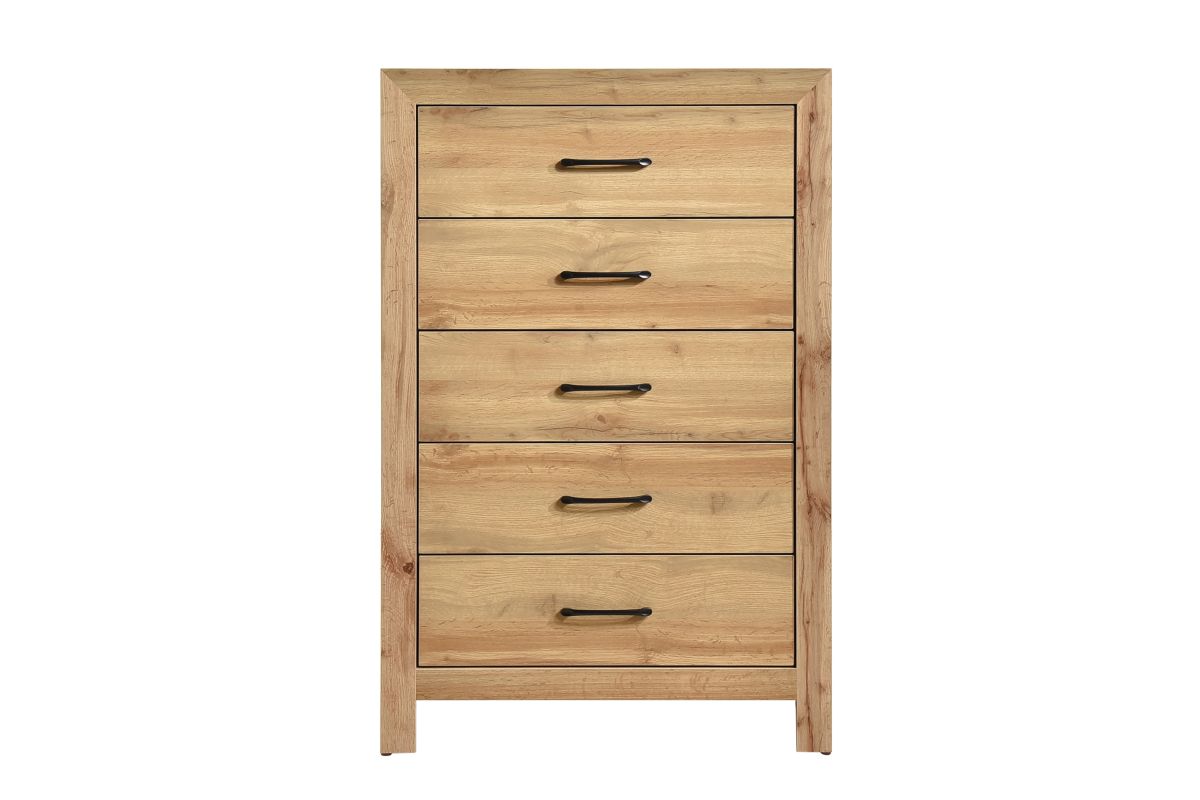 Optimize your bedroom storage with this elegant and space-saving 5-drawer chest, featuring a charming natural finish that brings a rustic touch to any decor. Constructed from a durable blend of faux wood veneer, wood, and engineered wood, this chest is built for longevity. It offers five generously sized drawers, each meticulously crafted with sturdy dovetail construction and smooth metal-on-metal center glides for effortless operation, all accentuated by stylish black nickel-tone bar pulls. Remarkably, this chest arrives fully assembled, ready to enhance your space right out of the box. The surface is also treated with a melamine laminate, providing exceptional resistance against everyday scratches and stains, ensuring its beauty endures for years. No assembly required.