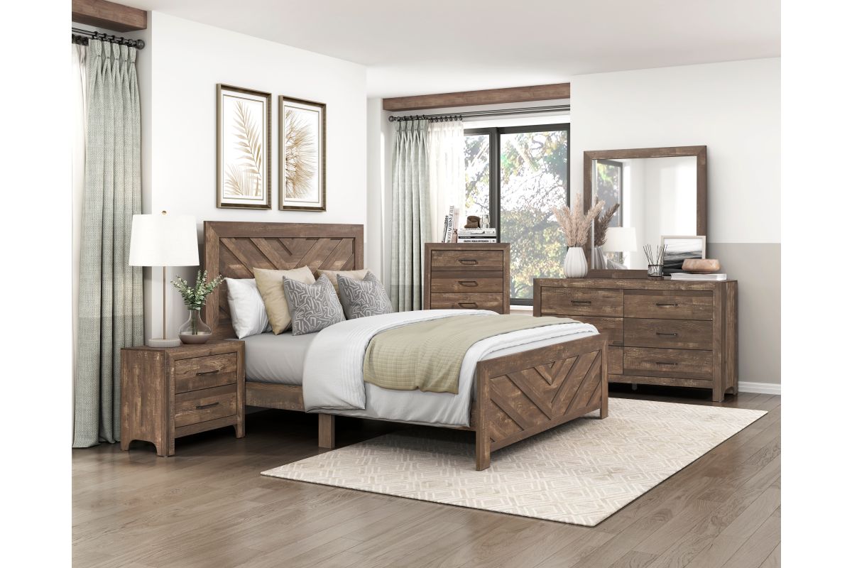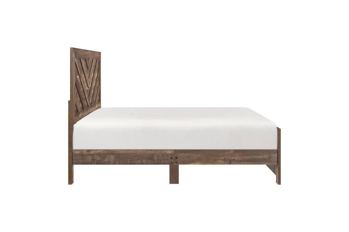 Modern lines and rustic styling are paired to create the look of the Corbin Collection. The 3D printed paper veneer's texture is highlighted by a brown finish for a realistic wood look. A bold V-pattern defines the face of the queen panel headboard and footboard, further lending to the unfettered design of the collection. The bed's construction allows for convenient packaging within one box. Assembly required.