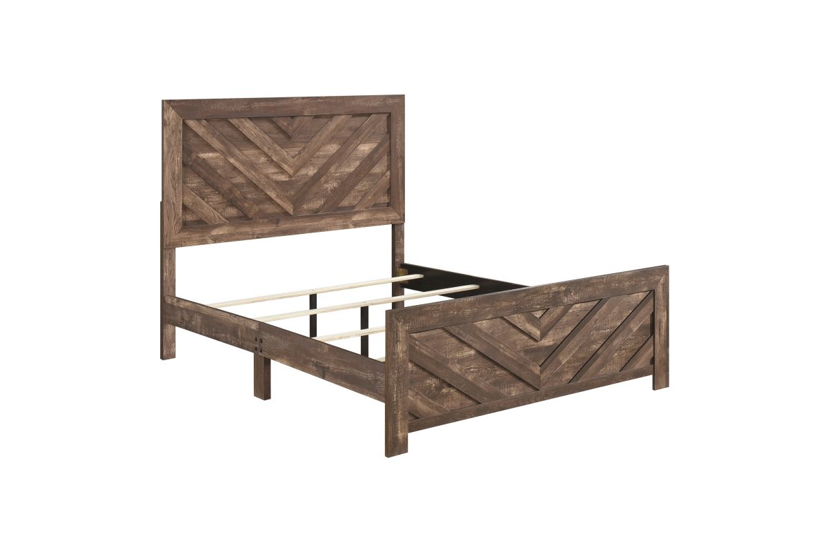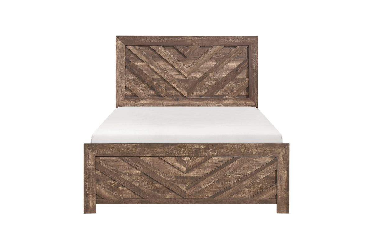 Modern lines and rustic styling are paired to create the look of the Corbin Collection. The 3D printed paper veneer's texture is highlighted by a brown finish for a realistic wood look. A bold V-pattern defines the face of the full-size panel headboard and footboard, further lending to the unfettered design of the collection. The bed's construction allows for convenient packaging within one box. Assembly required.