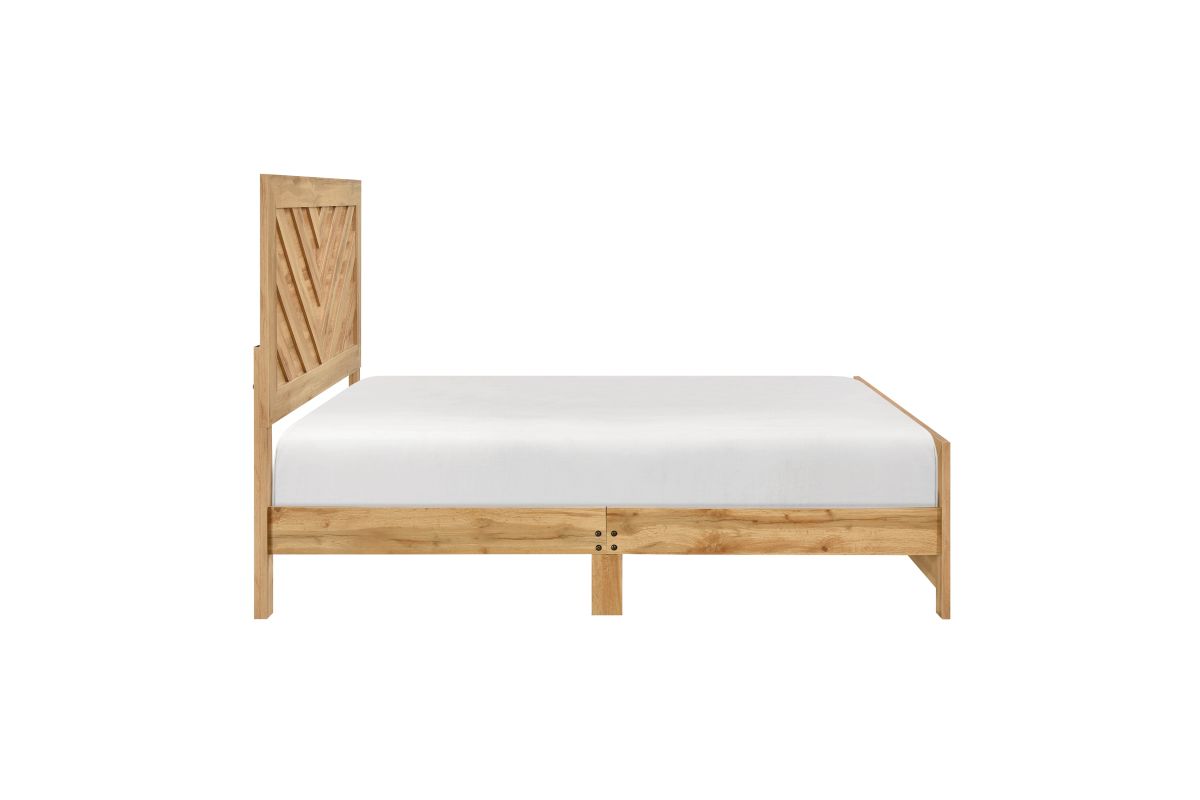 Elevate your bedroom with the distinctive style of this modern natural wood finish bed frame, featuring a striking chevron pattern on both the headboard and footboard. This "Bed in a Box" solution offers a complete and stylish foundation for your mattress, crafted from a durable blend of faux wood veneer, wood, and engineered wood for lasting quality. The warm natural finish beautifully highlights the intricate chevron design, creating a focal point in any room. Designed for convenience, it includes the headboard, footboard, and rails, ships efficiently in one compact box, and requires assembly, making it a perfect choice for those seeking contemporary aesthetics with practical delivery (foundation/box spring required).