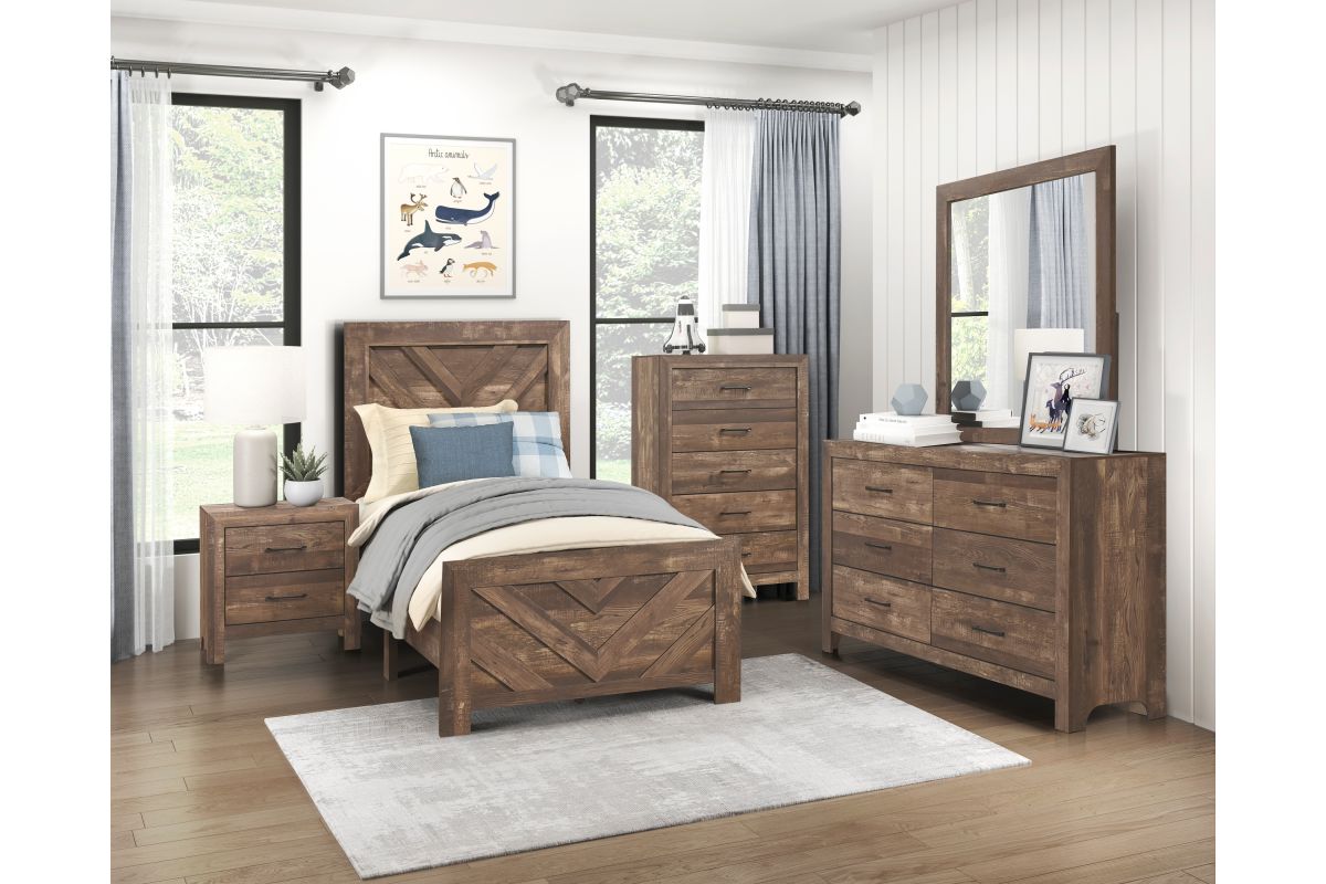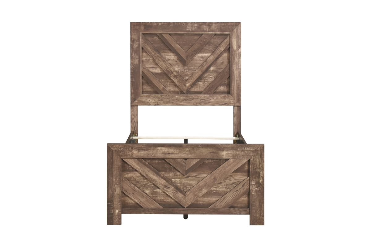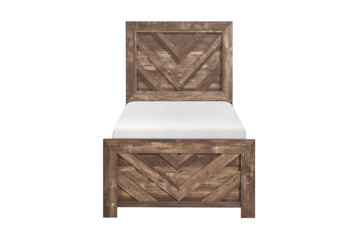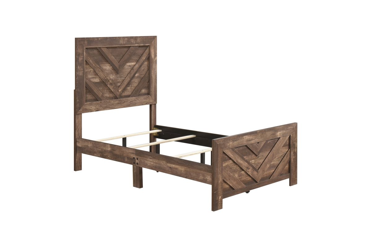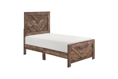 Modern lines and rustic styling are paired to create the look of the Corbin Collection. The 3D printed paper veneer's texture is highlighted by a brown finish for a realistic wood look. A bold V-pattern defines the face of the twin panel headboard and footboard, further lending to the unfettered design of the collection. The bed's construction allows for convenient packaging within one box. Assembly required.