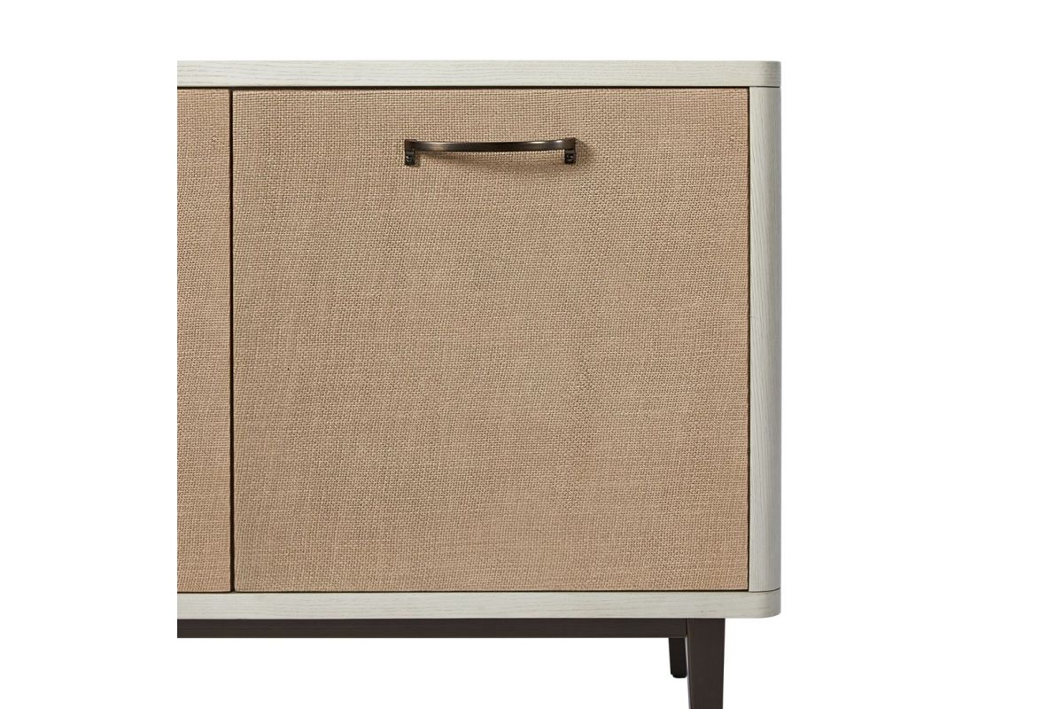 - Door panels include a mix of smooth wood grain and textured woven design for added visual interest.