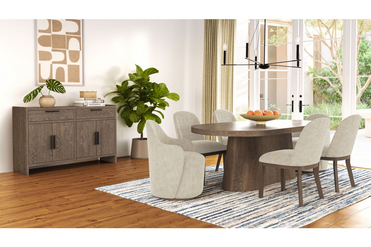 The Trilogy Dining Table in Cocoa offers a striking centerpiece for any dining room with its rich Oak Veneer finish and sturdy, heavy base. Designed with an elegant casual style, it blends sophistication and comfort seamlessly. The table's refined construction and luxurious tones create an inviting atmosphere, making it the perfect setting for family gatherings and special occasions. Its timeless design ensures it complements a variety of decor styles, providing both beauty and function to your home. Assembly required.