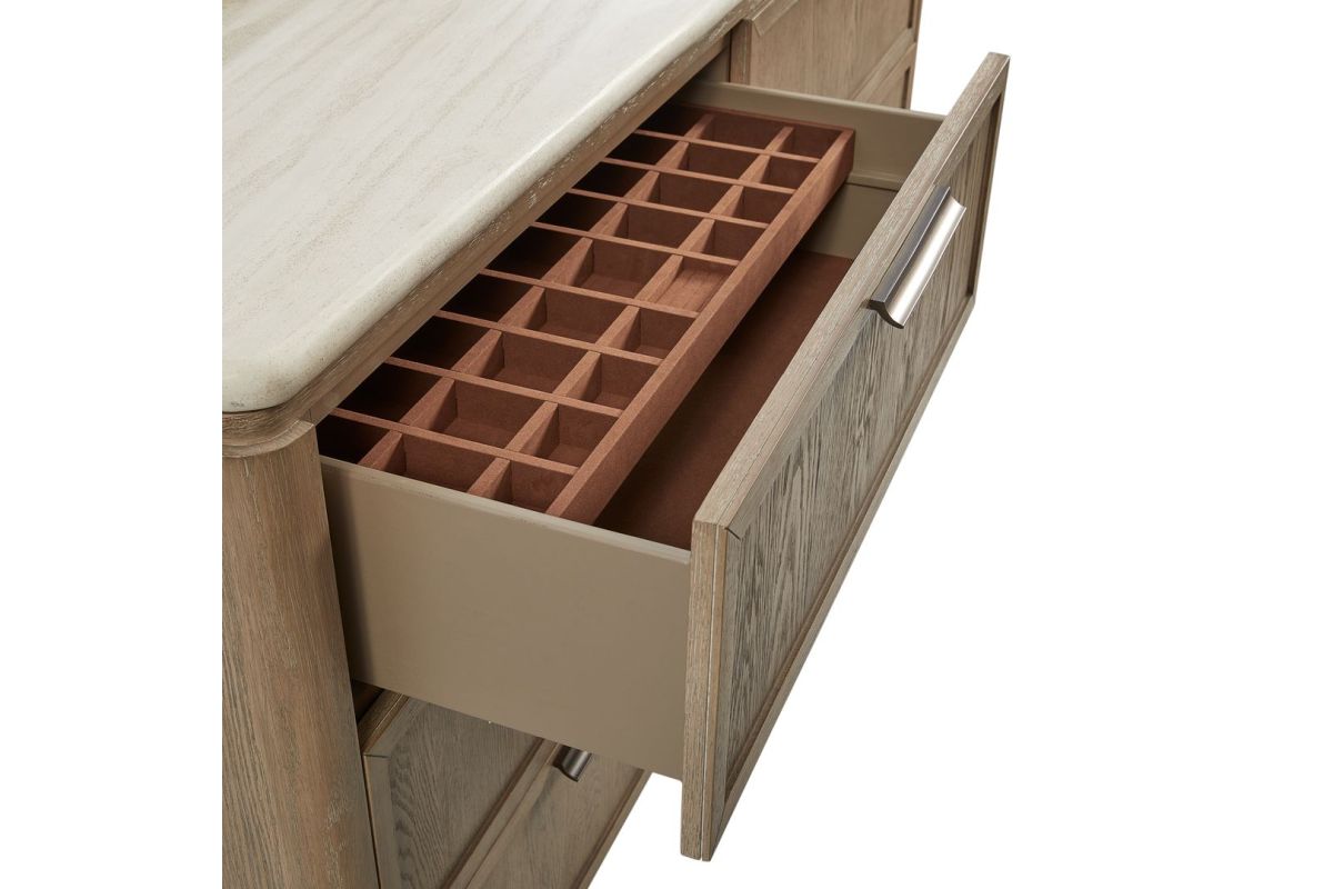 The Trilogy Dresser offers a perfect balance of natural elegance and practical storage. Featuring six spacious drawers, this dresser is designed to keep your wardrobe organized and your space serene. The oak veneer drawer fronts bring a warm, organic texture to the sleek, contemporary profile, finished in a rich, versatile tone. Thoughtfully designed with soft-touch, self-closing drawer guides, the dresser includes felt-lined top drawers for delicate accessories and cedar-lined bottom drawers to preserve clothing freshness. Sophisticated and functional, the Trilogy Dresser is a refined addition to any bedroom setting. No assembly required.