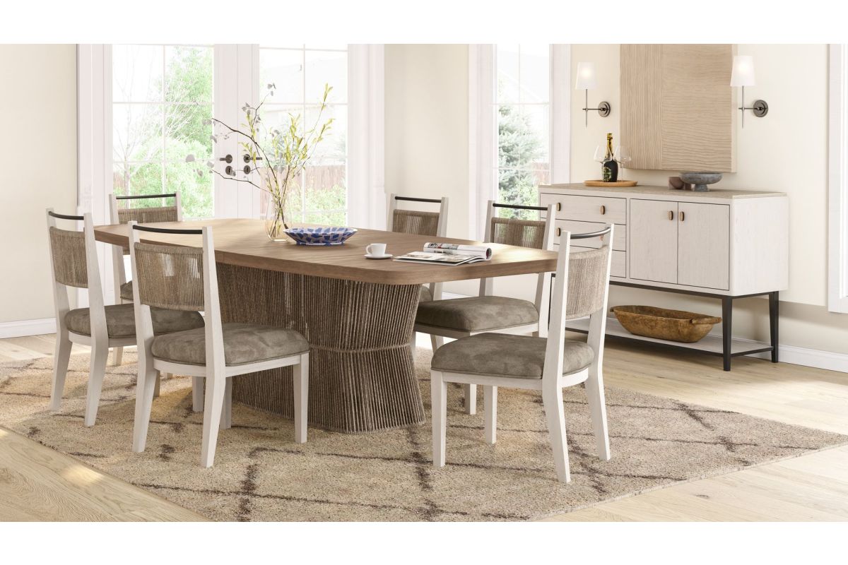 The Trilogy Dining Table embodies refined elegance with a casual charm, making it a versatile centerpiece for any dining space. Crafted from high-quality oak veneers and finished in a warm toffee tone, it exudes a timeless appeal. Its design offers both luxurious comfort and functionality, featuring an 18-inch leaf that seamlessly extends the table to an impressive 98 inches, perfect for accommodating larger gatherings. With its elegant casual aesthetic, the Trilogy Dining Table promises to elevate your dining experience while blending effortlessly with a variety of interior styles. Assembly required.