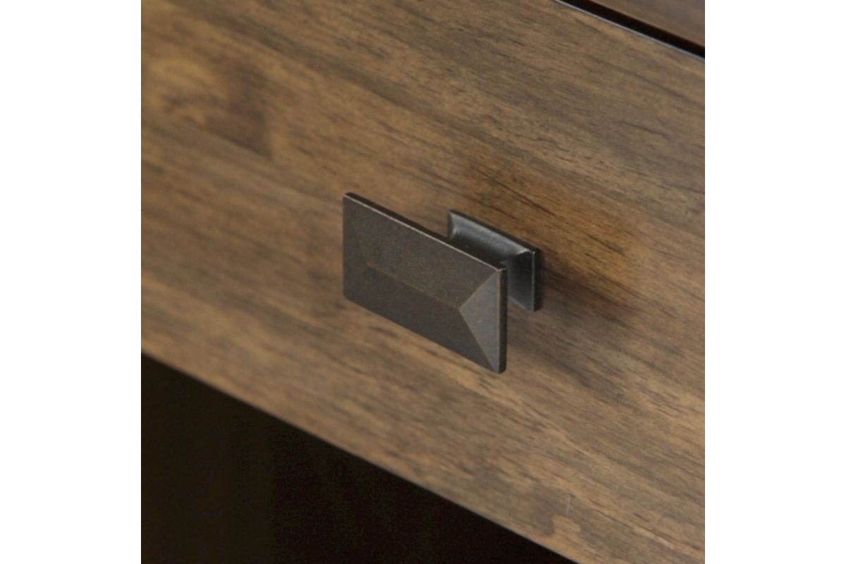 - Transitional design includes clean angle-edged tabletop, square, slightly tapered legs, and rectangular antique bronze knobs