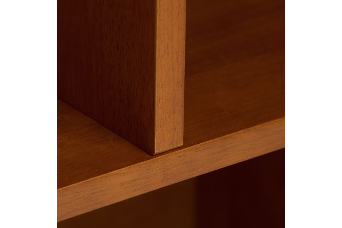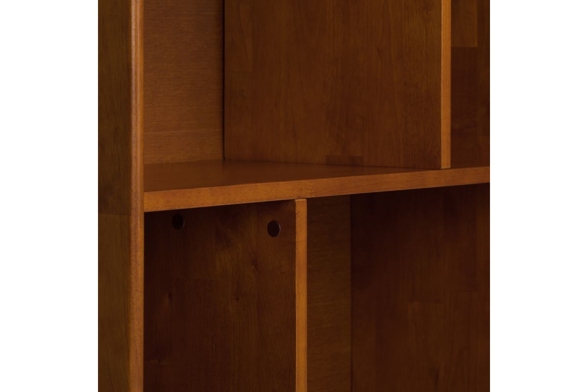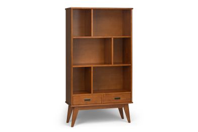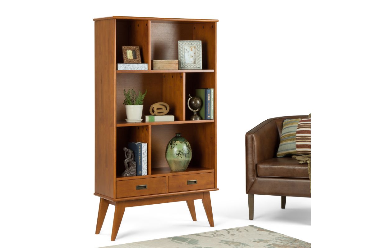 Display your favorite books and keepsakes in the Draper Mid Century Wide Bookcase with Storage. This piece is crafted from solid hardwood and combines a mid-century modern design with function. The Draper Mid Century Wide Bookcase with Storage features six shelves and two drawers providing the ultimate solution for all your storage needs. This bookcase delivers a clean lined, contemporary feel to your living room, family room or home office. Assembly required.