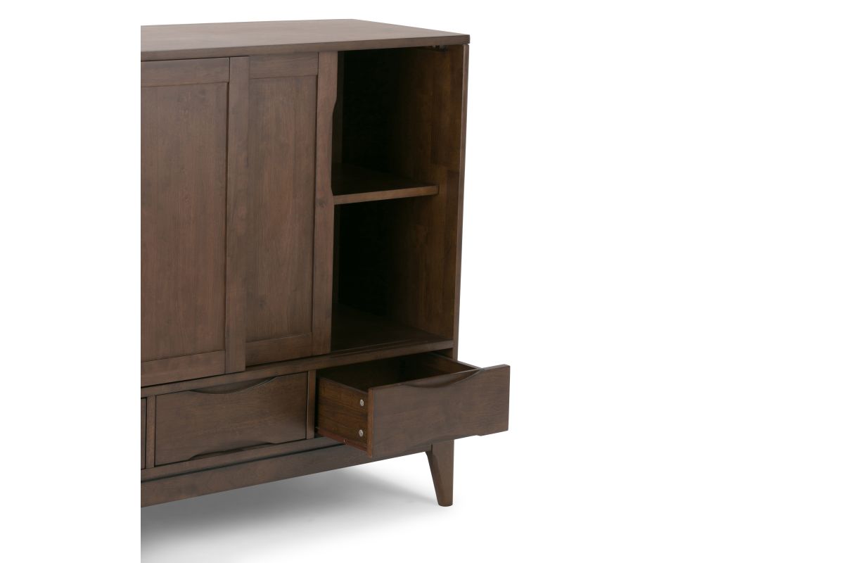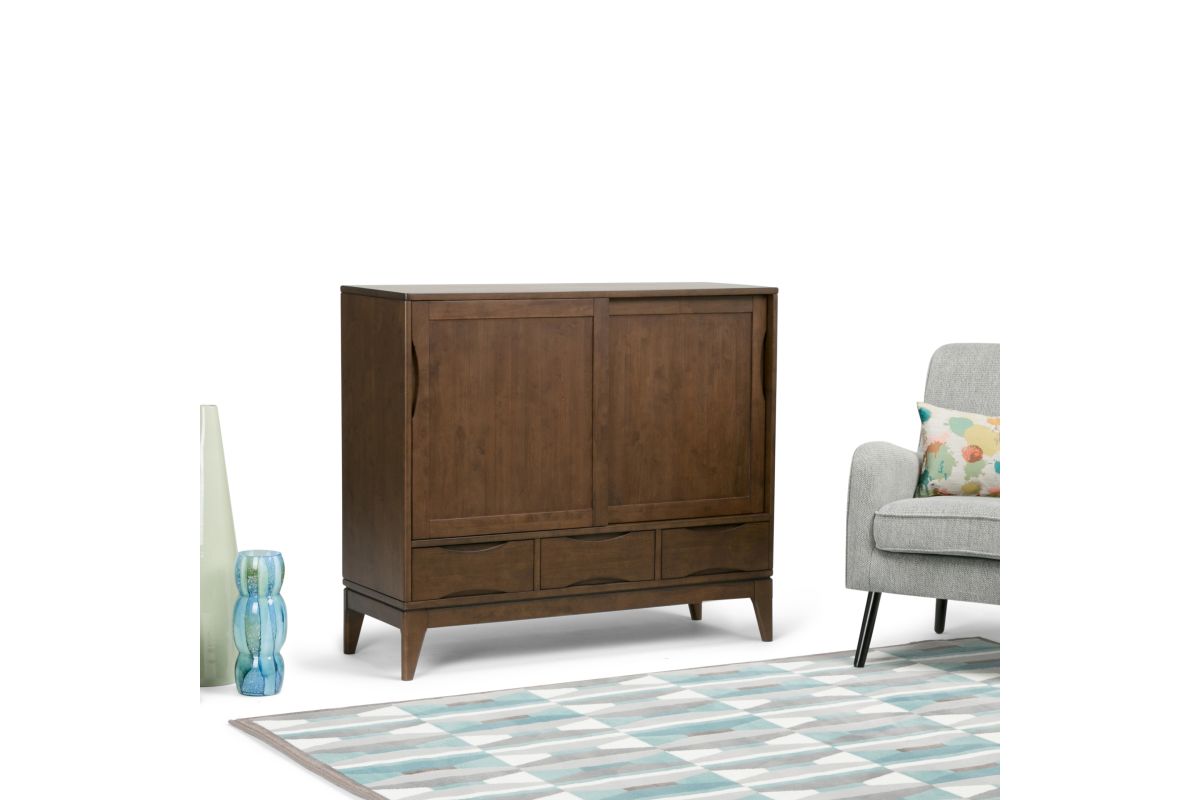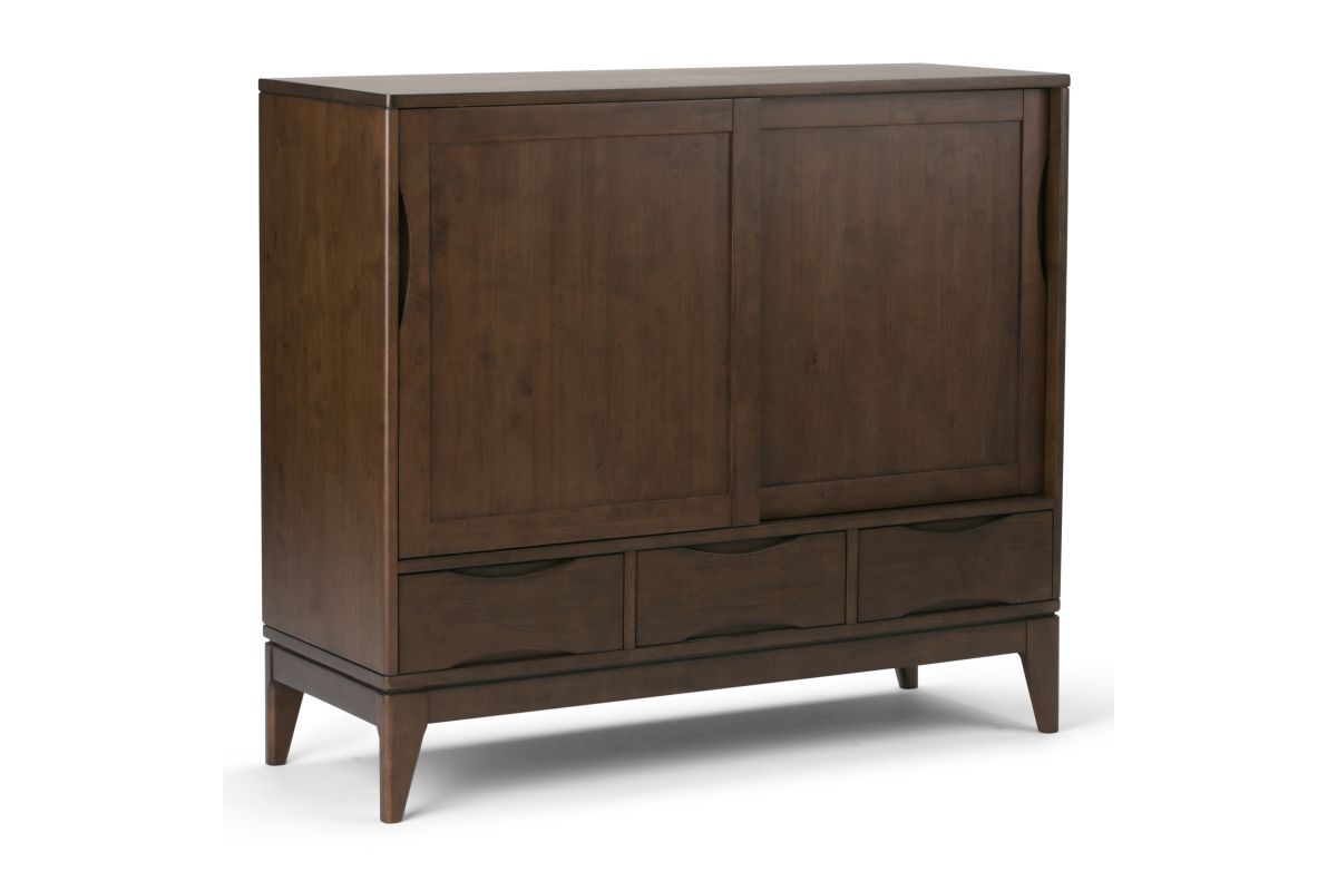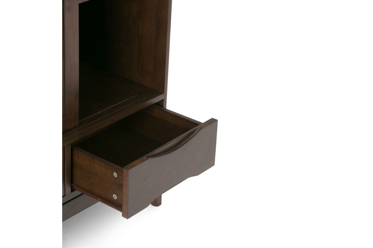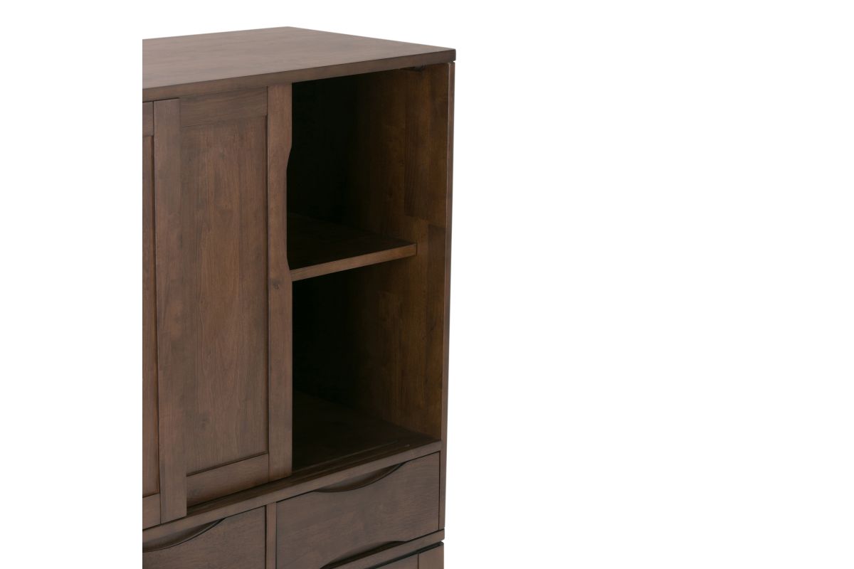 The Harper Medium Storage Cabinet is an attractive, contemporary functional and versatile piece. This cabinet is crafted of solid hardwood with a rich finish. The two notched handle doors slide open to two adjustable shelves that you can reconfigure to suit your needs. The three bottom drawers provide more compact and organized storage space. Use the Harper Medium Storage Cabinet in your family room, living room, dining room, hallway or den. Assembly required.