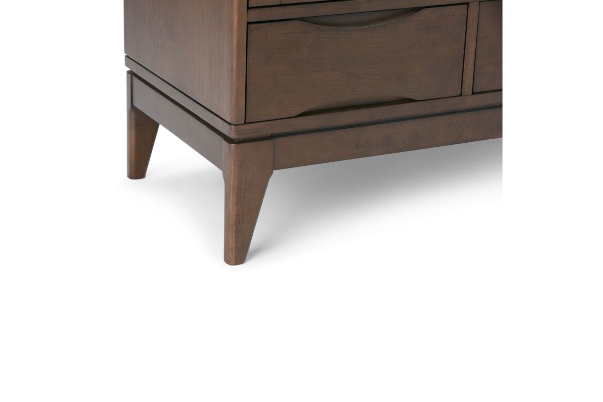 - Mid Century Modern design includes notched handles on doors, drawers and angled tapered legs