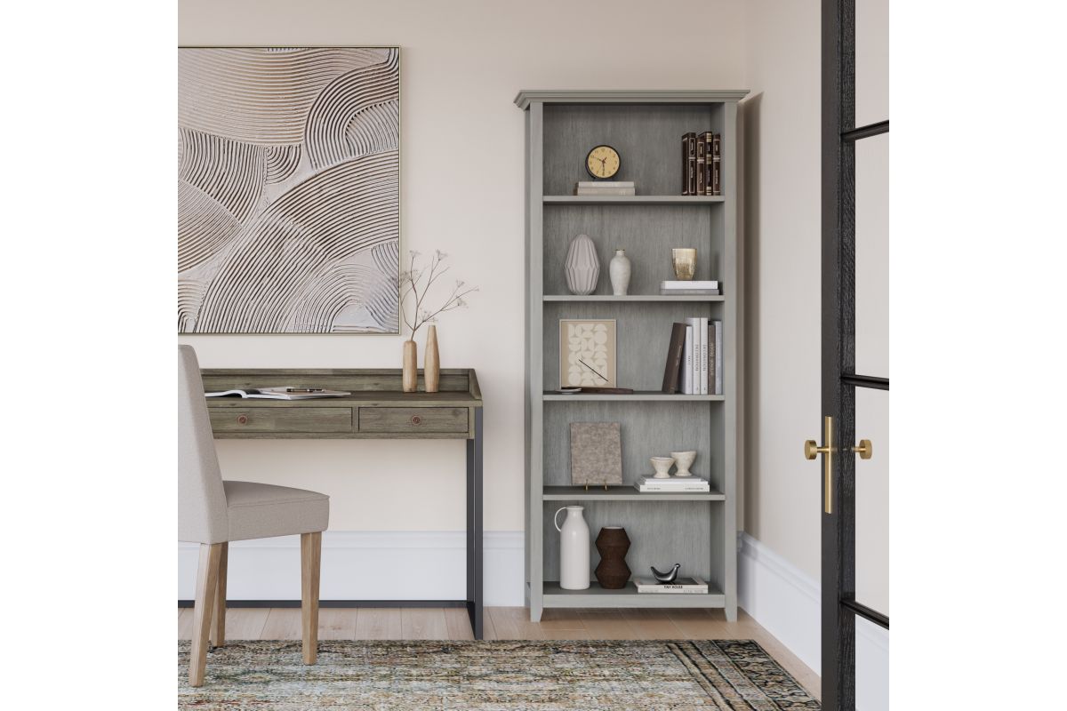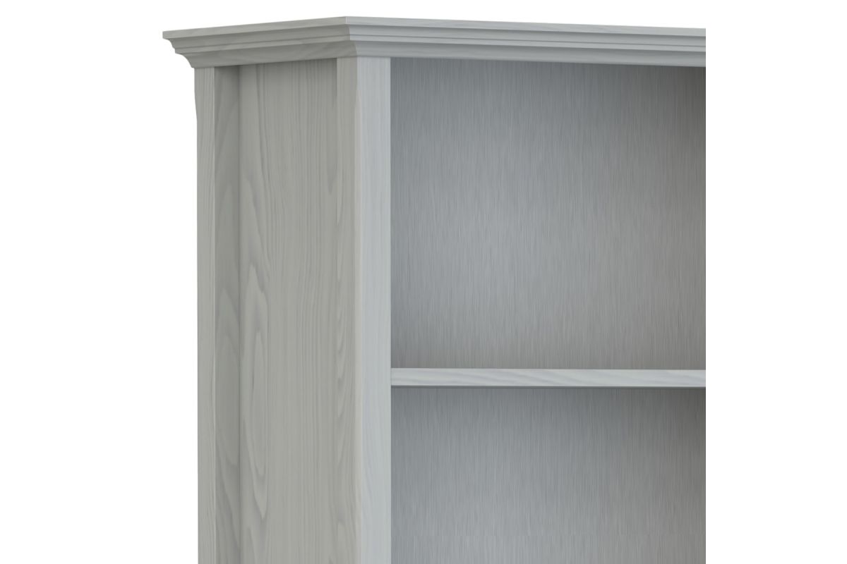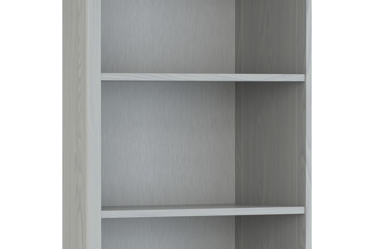 - Fog Grey Finish: A fog grey stain enhances the natural wood grain adding subtle elegance to a space; inspired by transitional craftsmanship, this tall bookshelf features a refined silhouette with elegant molding details.