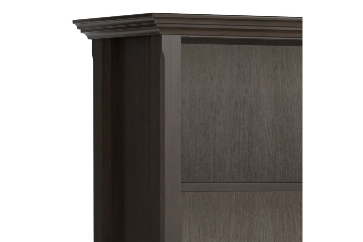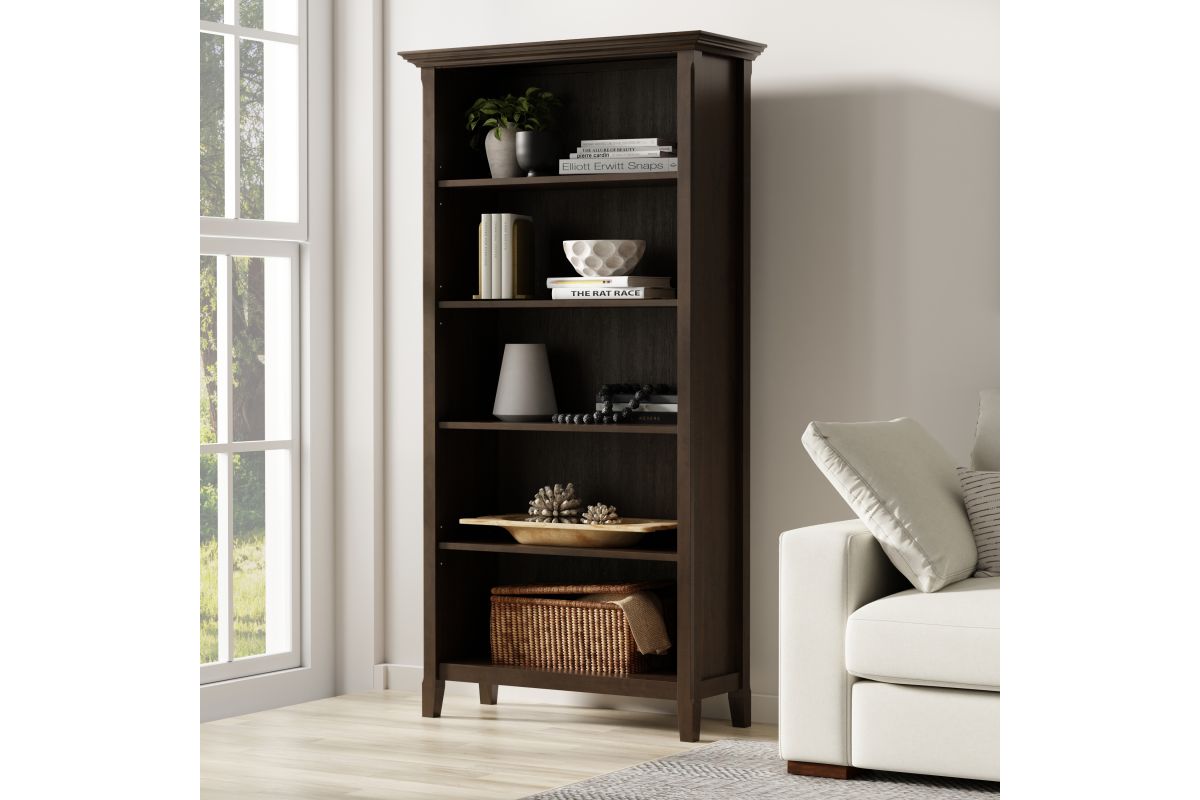 Crafted for both style and function, the Amherst 36 Inch 5 Shelf Bookcase offers expansive storage in a timeless design. Made from sustainably sourced, kiln-dried solid pine wood, this wide bookcase features a rich hickory brown finish, enhancing the natural grain and texture. Four adjustable shelves and one fixed shelf provide versatile organization, accommodating books, collectibles, and home office essentials. Designed with classic crown molding and clean lines, this solid wood bookshelf brings a refined presence to living rooms, home offices, or libraries. Its sturdy construction, enhanced by a protective lacquer finish, ensures long-lasting durability, while the eco-friendly materials support a sustainable lifestyle. Assembly required.