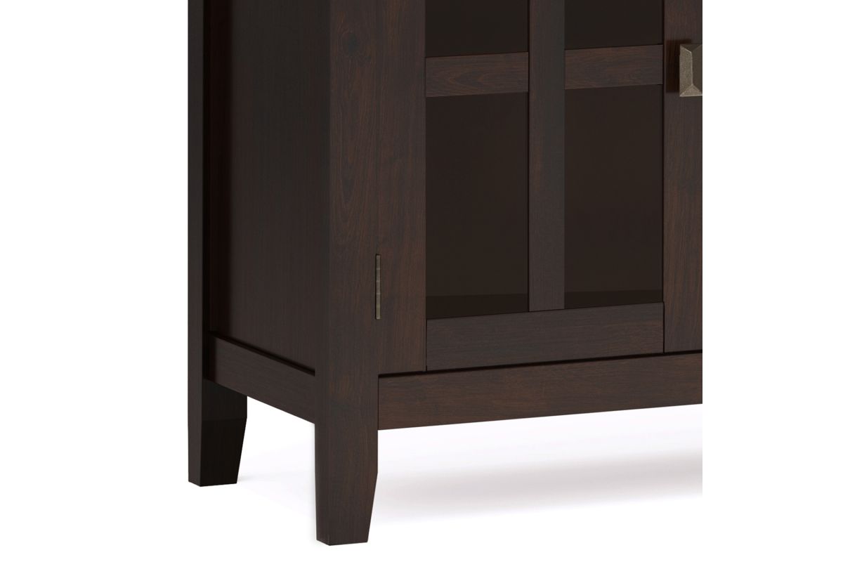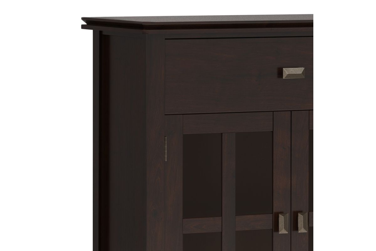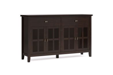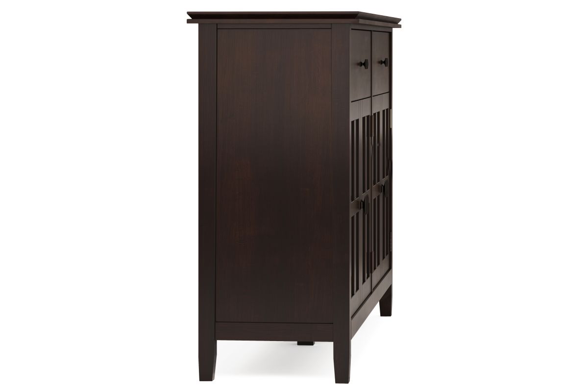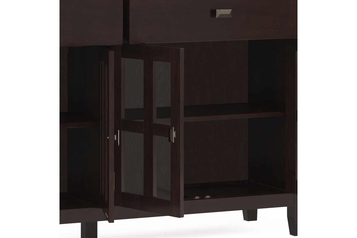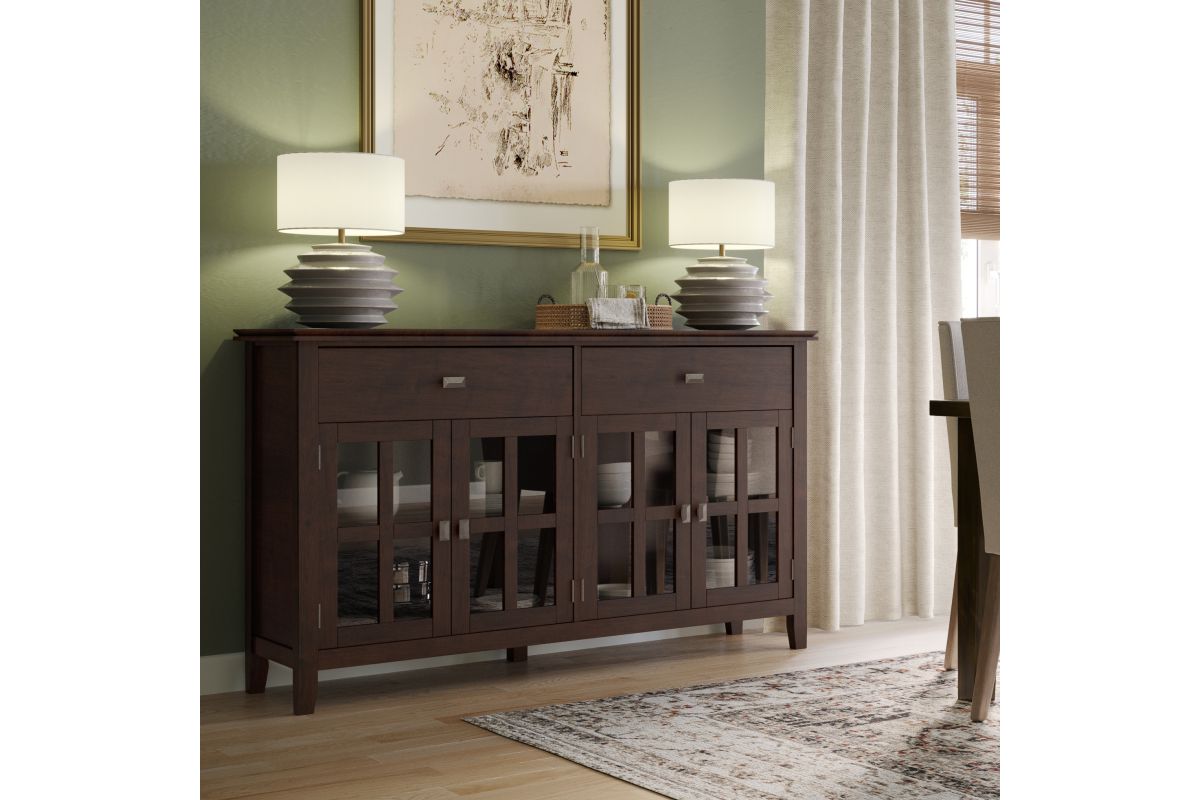 A classic blend of style and functionality, the Artisan Large 4 Door Sideboard Buffet in Dark Chestnut Brown is an elegant addition to any home. Handcrafted with a hand-applied stain that highlights the wood grain, this solid wood sideboard features four tempered glass doors, adjustable shelves, and generous interior space for organizing dinnerware, books, or decorative pieces. Perfect for dining rooms, entryways, or living areas, this sideboard offers both timeless beauty and everyday practicality. Assembly required.