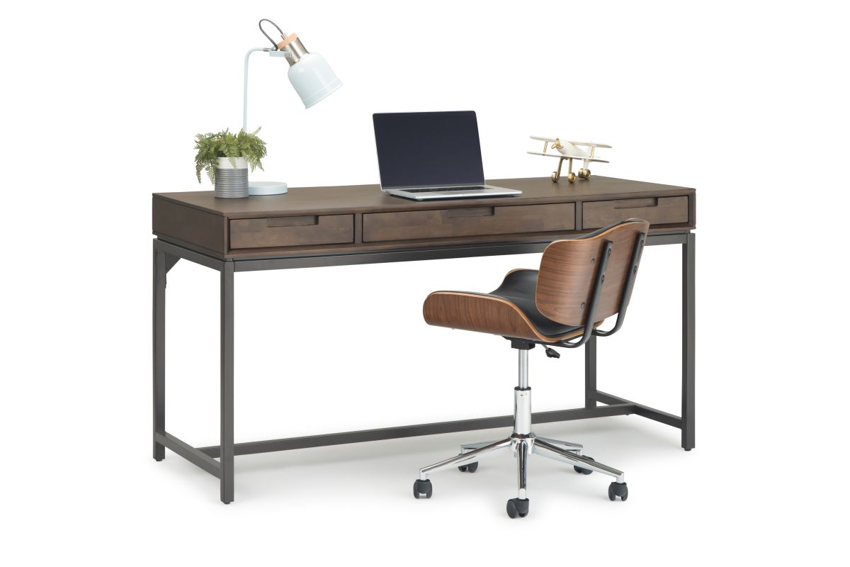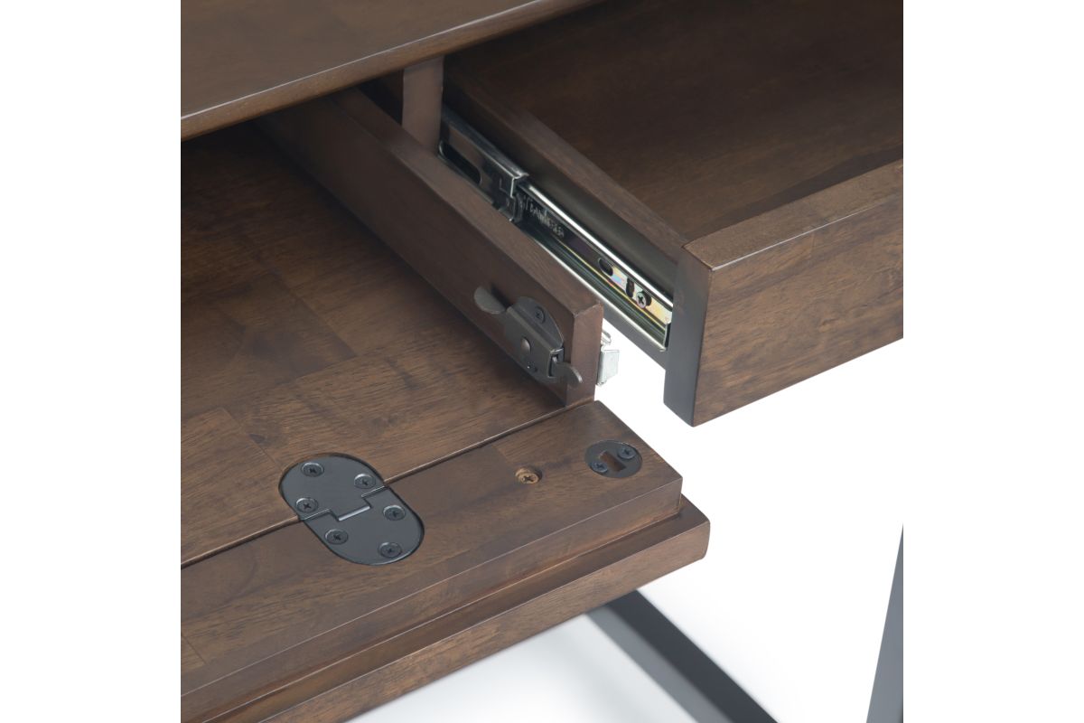 The Banting Collection is made from richly-grained solid Rubberwood. This mid-century modern industrial collection has a clean angular metal base, with square, simple modern drawer and table top. With no visible hardware, and only simple wood pull handles, the solid Rubberwood top, is simple and uncomplex. The Banting Desk has two working side drawers with ball bearing drawer glides and one centre flip down drawer/keyboard tray to maximize functionality. The 24" x 60" size is large enough for a well appointed home office, and narrow enough to fit into your living room or even kitchen. The Banting collection includes coffee, console, end tables, tv stands, sideboard buffet, desks and bookcase. Assembly required.