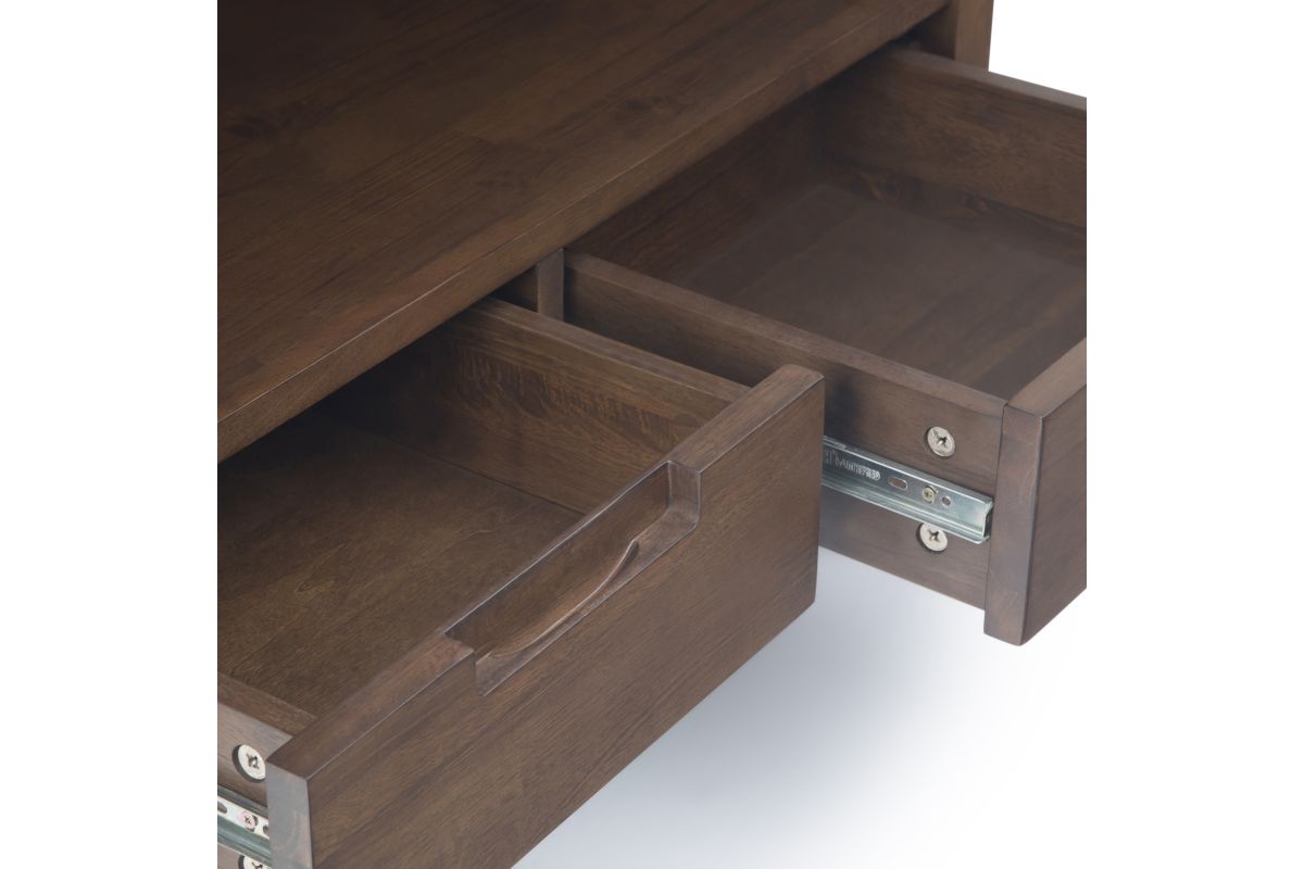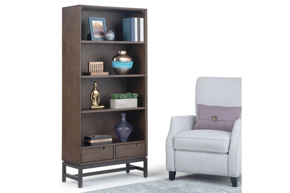The Banting Collection is made from richly-grained solid Rubberwood. This mid-century modern industrial collection has a clean angular metal base, with square, simple modern drawer and table top. With no visible hardware, and only simple wood pull handles, the solid Rubberwood top, is simple and uncomplex. The Banting Bookcase has two adjustable shelves and one fixed shelf with 2 small drawers for maximum functionality. The 30" width x 14" depth make this beautiful bookstand usable in your home office, living room, basement or den. The Banting collection includes coffee, console, end tables, tv stands, sideboard buffet, desks and bookcase. Assembly required.