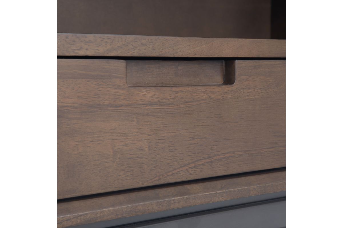 - Features two adjustable shelves, one fixed shelf with 2 small drawers on a metal frame and legs in Graphite Grey