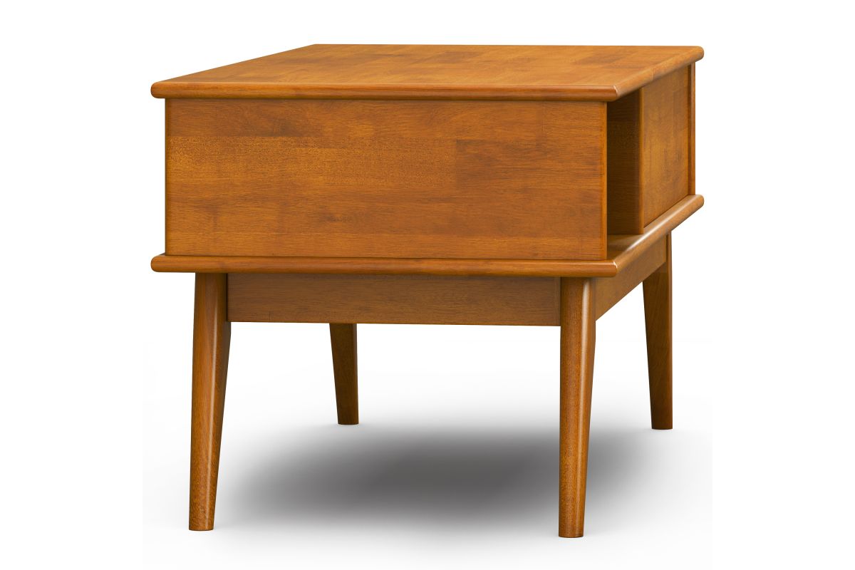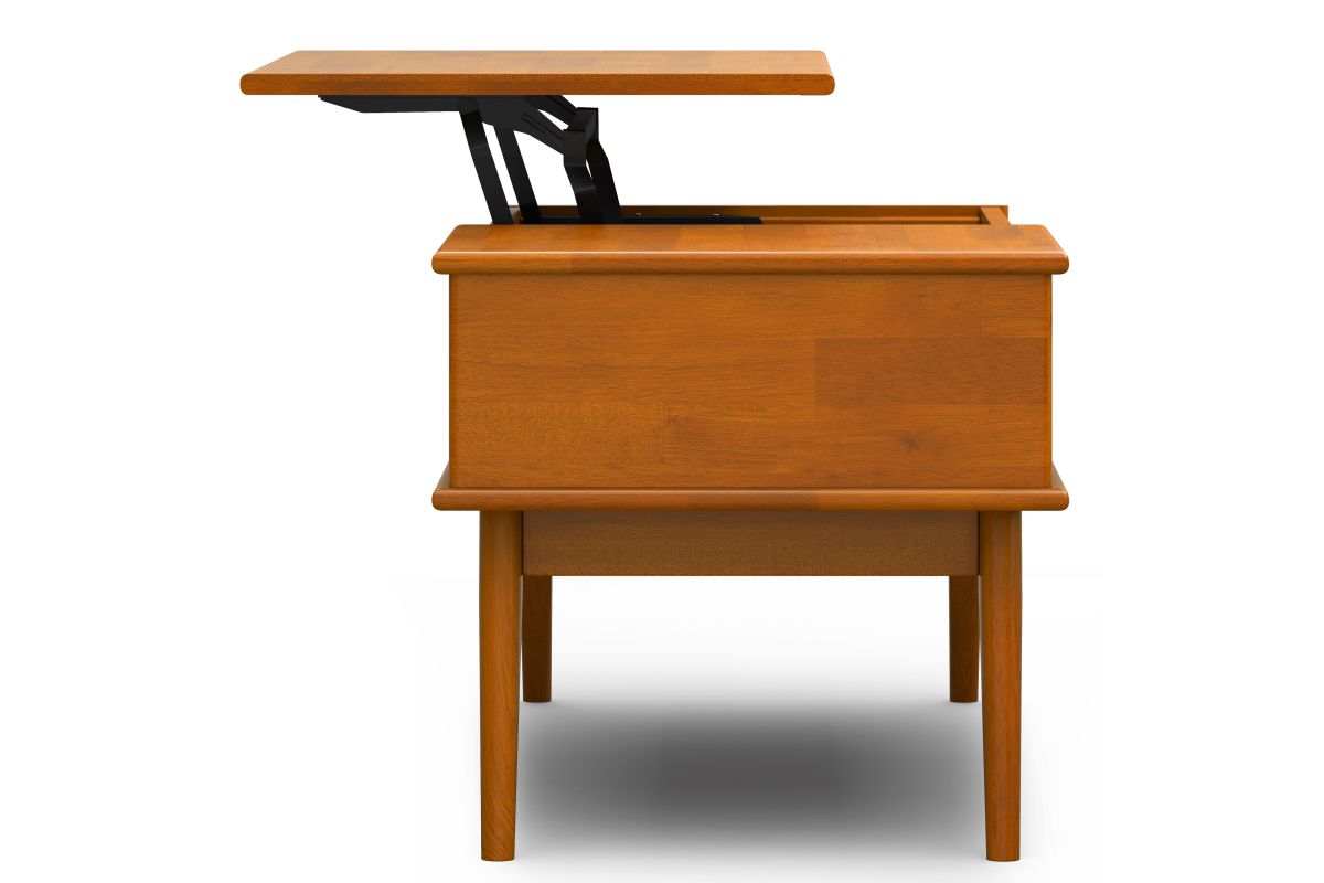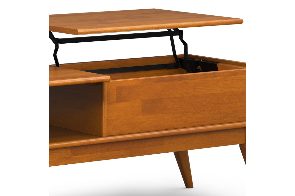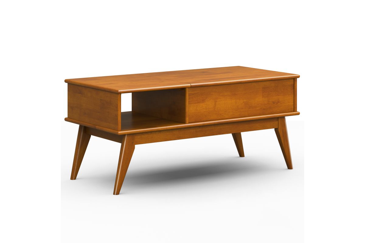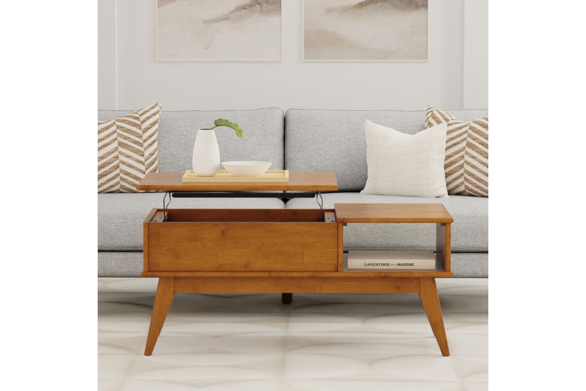 You have a beautiful sofa but there is something missing. It could be this stylish modern Draper Mid Century Lift Top Coffee Table. This coffee table fills so many needs. Half of the top lifts to reveal hidden storage, pulling toward you for the perfect surface to type on your laptop or eat in front of the television. The open pass through is perfect for stowing your books or games. keeping the beautiful warm-toned top clear of clutter. Assembly required.