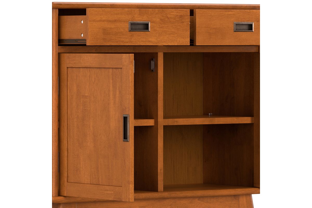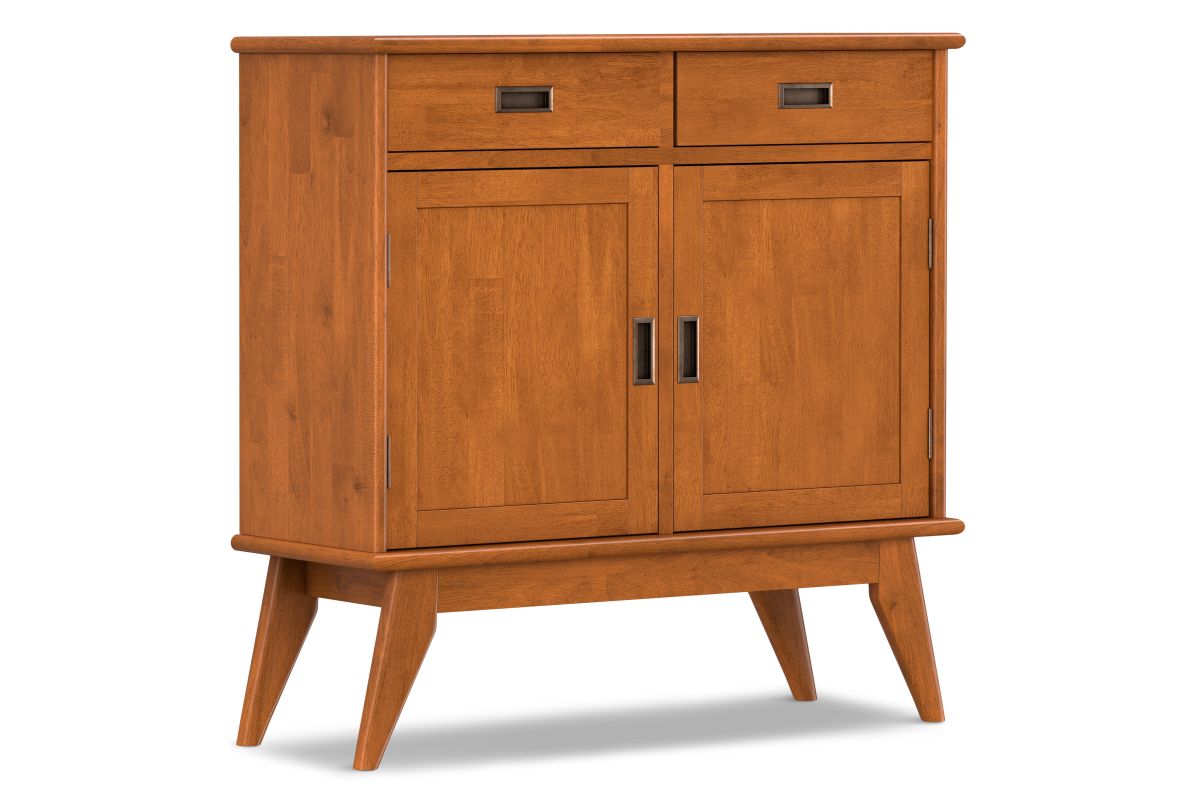 - Features two drawers for keys, gloves and other items and two doors with interior storage and two adjustable shelves