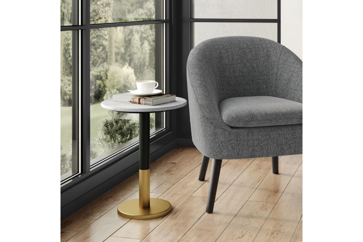 The Evans Genuine Marble Accent Side End Table blends timeless sophistication with modern functionality. Crafted from luxurious genuine white marble and sturdy powder-coated metal legs, this round side table features a sleek and versatile design. Perfect for use in living rooms, bedrooms, dens, or entryways, it serves as an accent table, end table, or bedside table, adding a touch of elegance and practicality to your space. Its compact size and durable construction make it ideal for both residential and commercial use. Assembly required.
