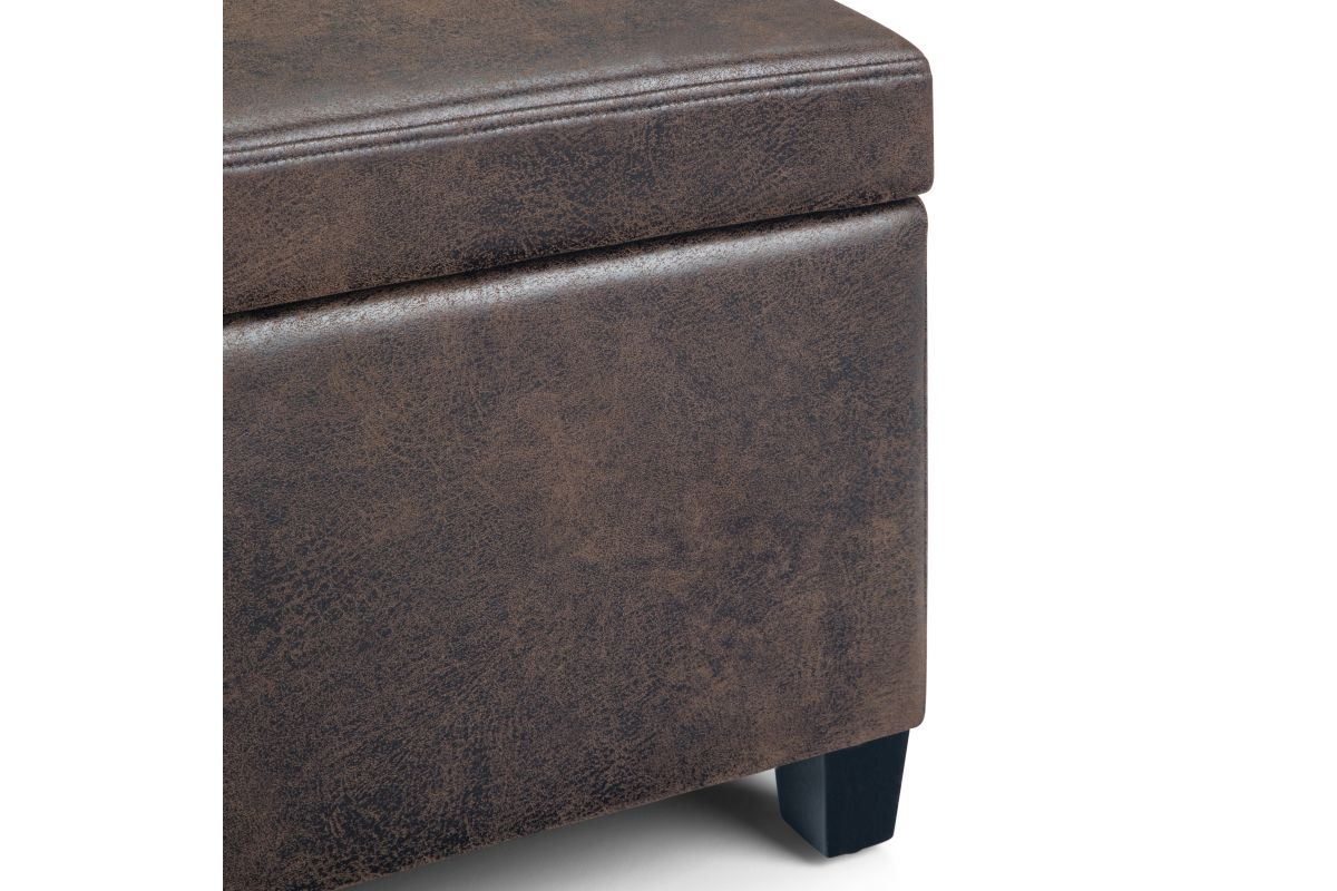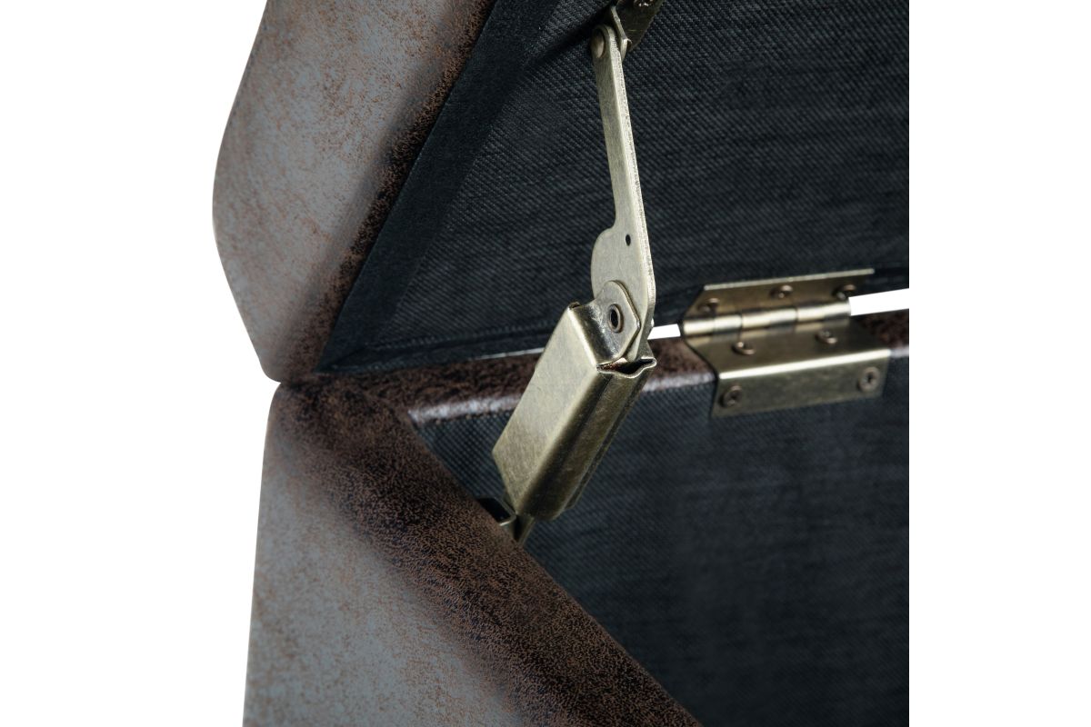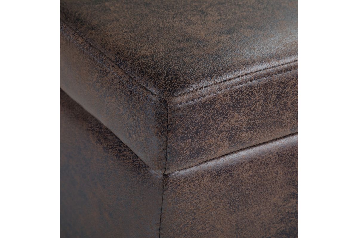 - Upholstered with a durable Distressed Brown Vegan Faux Leather