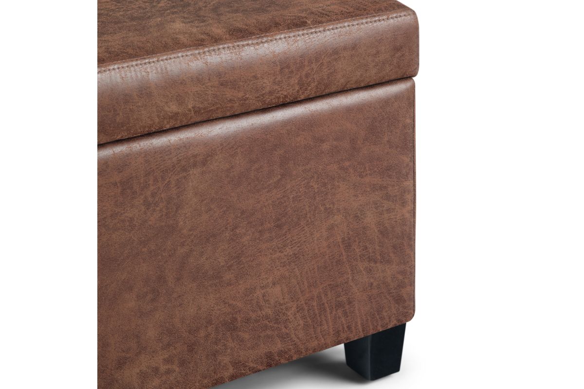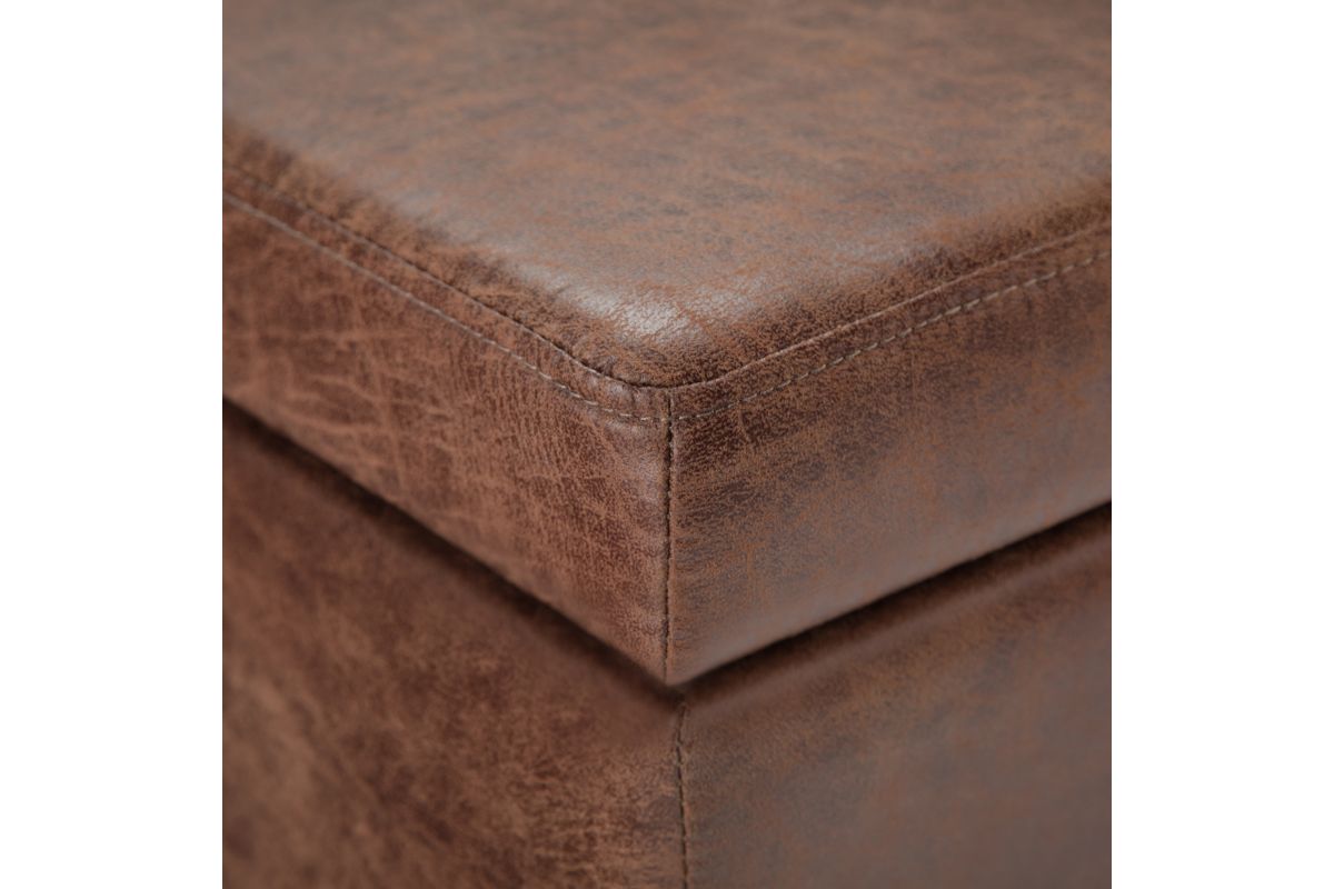 - Upholstered with a durable Distressed Umber Brown Vegan Faux Leather