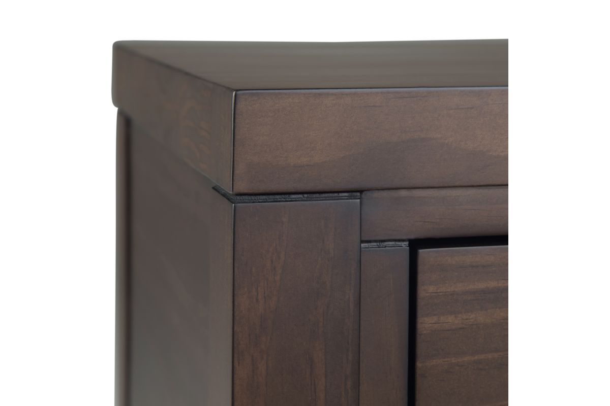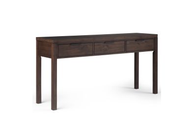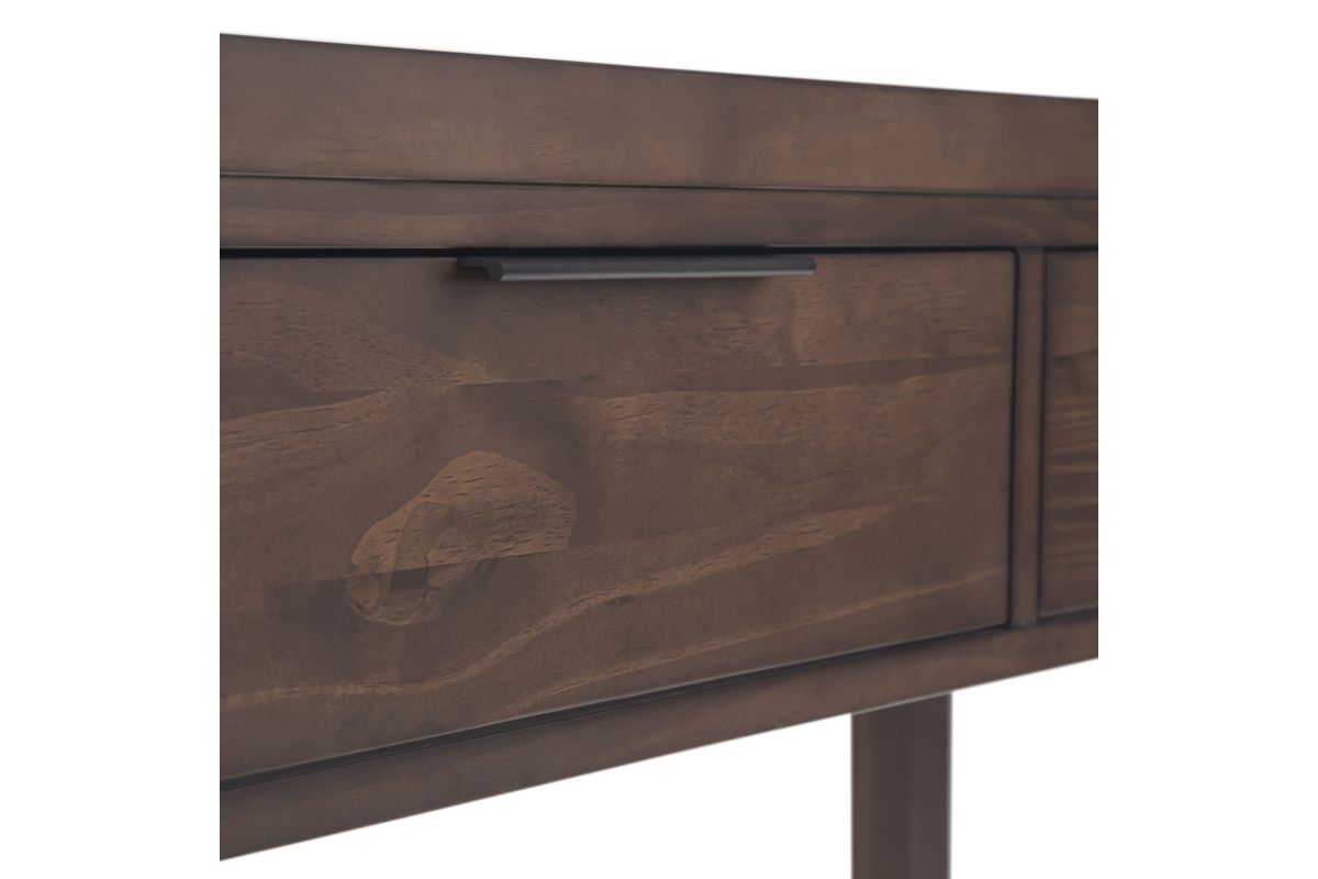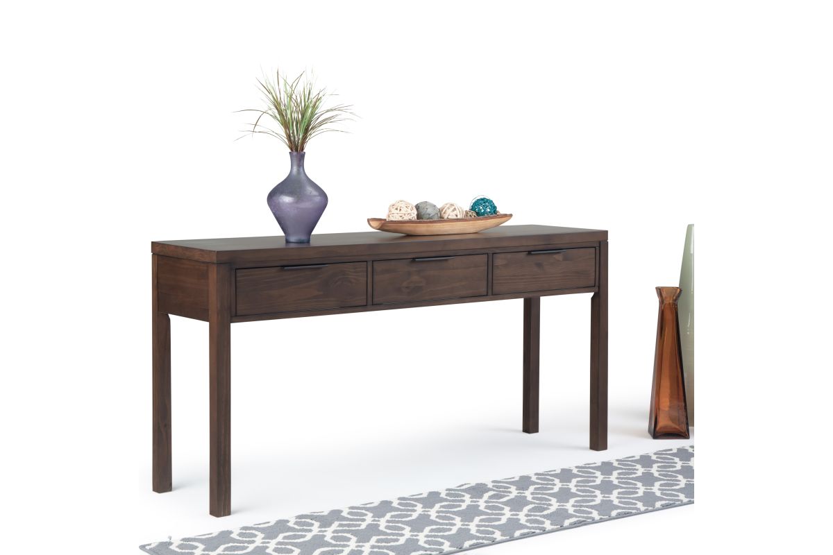 Crafted for versatility and timeless appeal, the Hollander Wide Console Table blends modern simplicity with classic craftsmanship. Handcrafted from kiln-dried solid pine wood, this wood console table features a warm walnut brown finish, accentuating the natural grain and depth of the wood. Three spacious storage drawers glide smoothly on metal runners, offering discreet organization for keys, mail, and essentials. The clean-lined frame and sleek metal hardware reflect a contemporary design aesthetic, making this entryway table equally suited for hallways, living rooms, or behind a sofa. Sustainably sourced and built to last, this solid wood console table provides style and functionality for any space. Assembly required.