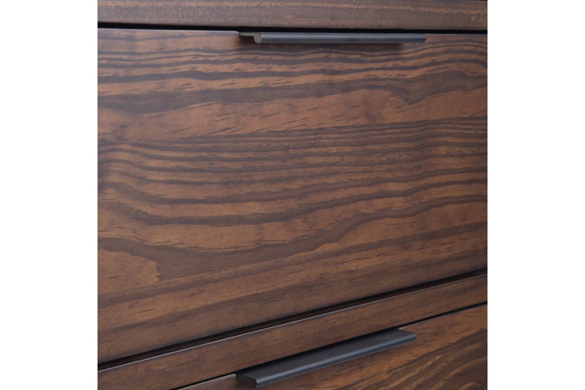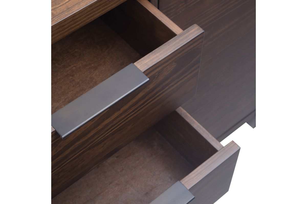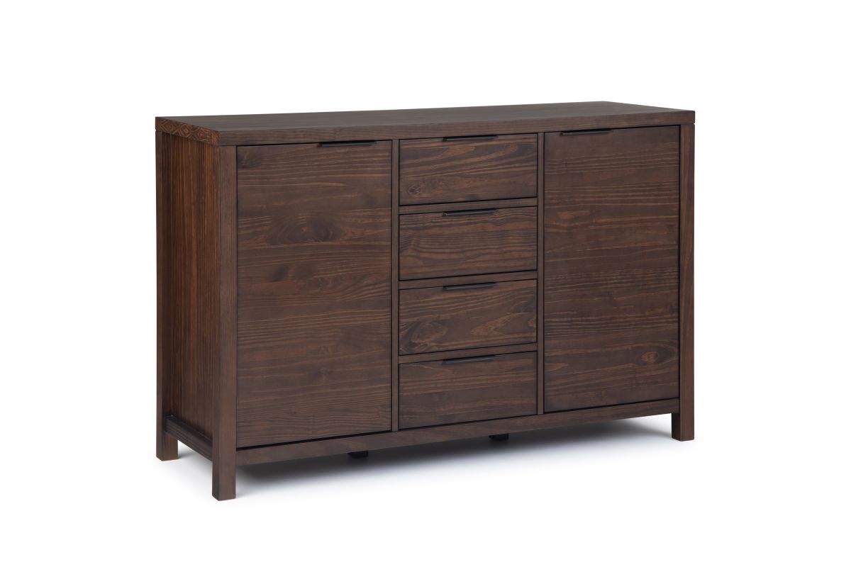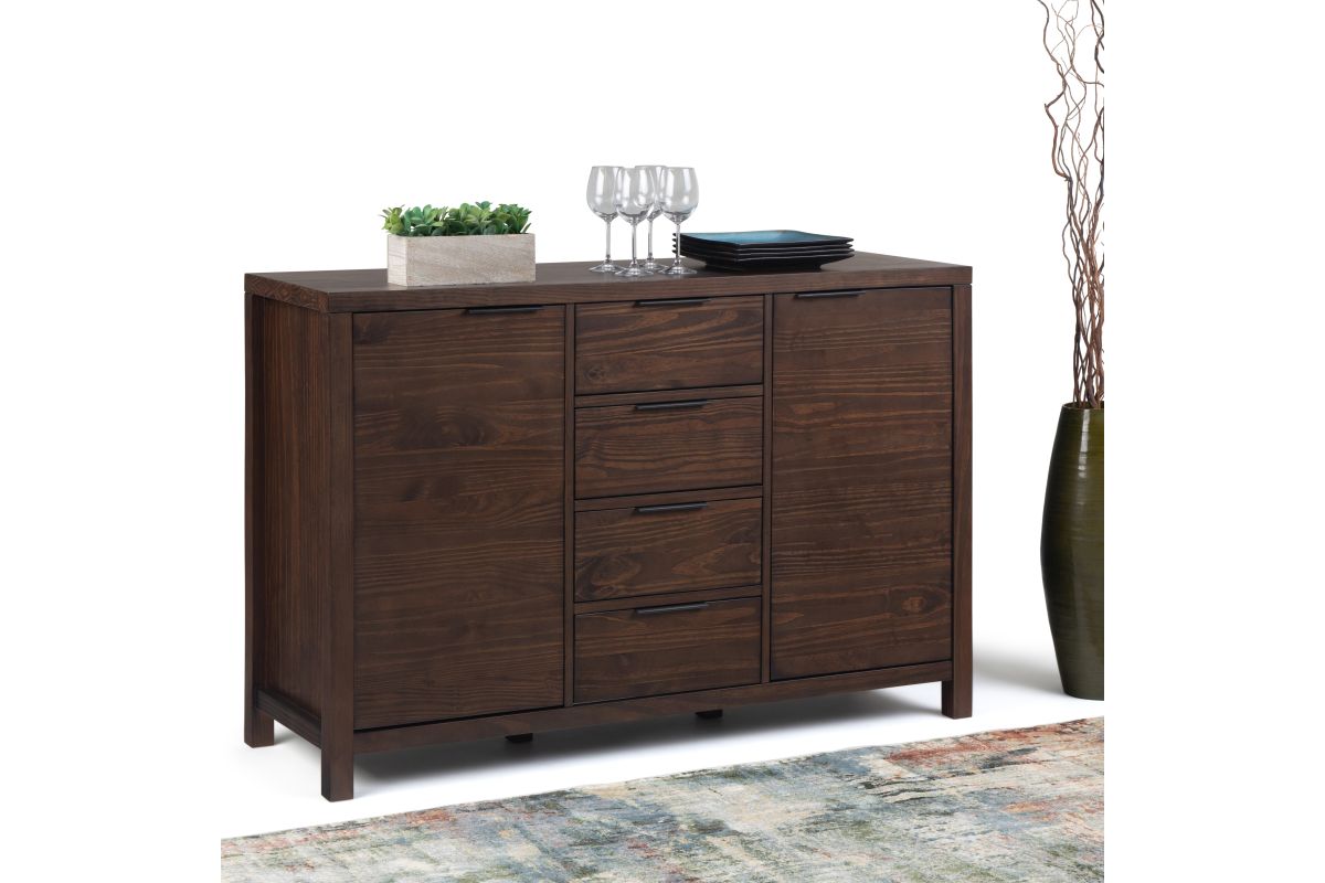 The Hollander Collection is modern in sensibility with clean, crisp lines. Nevertheless, it remains a warm and homey due to its stained solid wood construction. The Hollander Sideboard Buffet Credenza is generously sized at 54" w x 18" d and is perfect for your dining or living area. Most use it as a sideboard or buffet, but can also be used in a bedroom or as a TV Stand. It comes with four (4) large drawers with ball bearing high quality drawer glides and two (2) doors with two (2) interior adjustable shelves on each side. Great storage for your cutlery, your fine china or servicing trays. Assembly required.