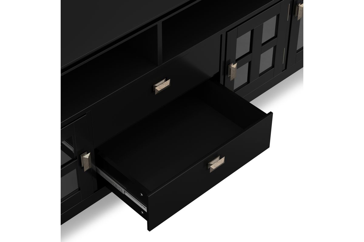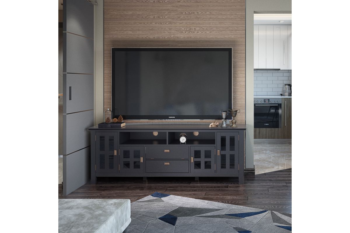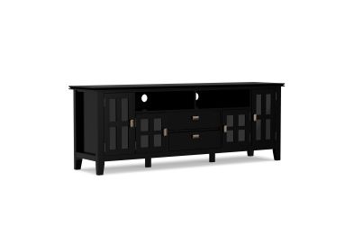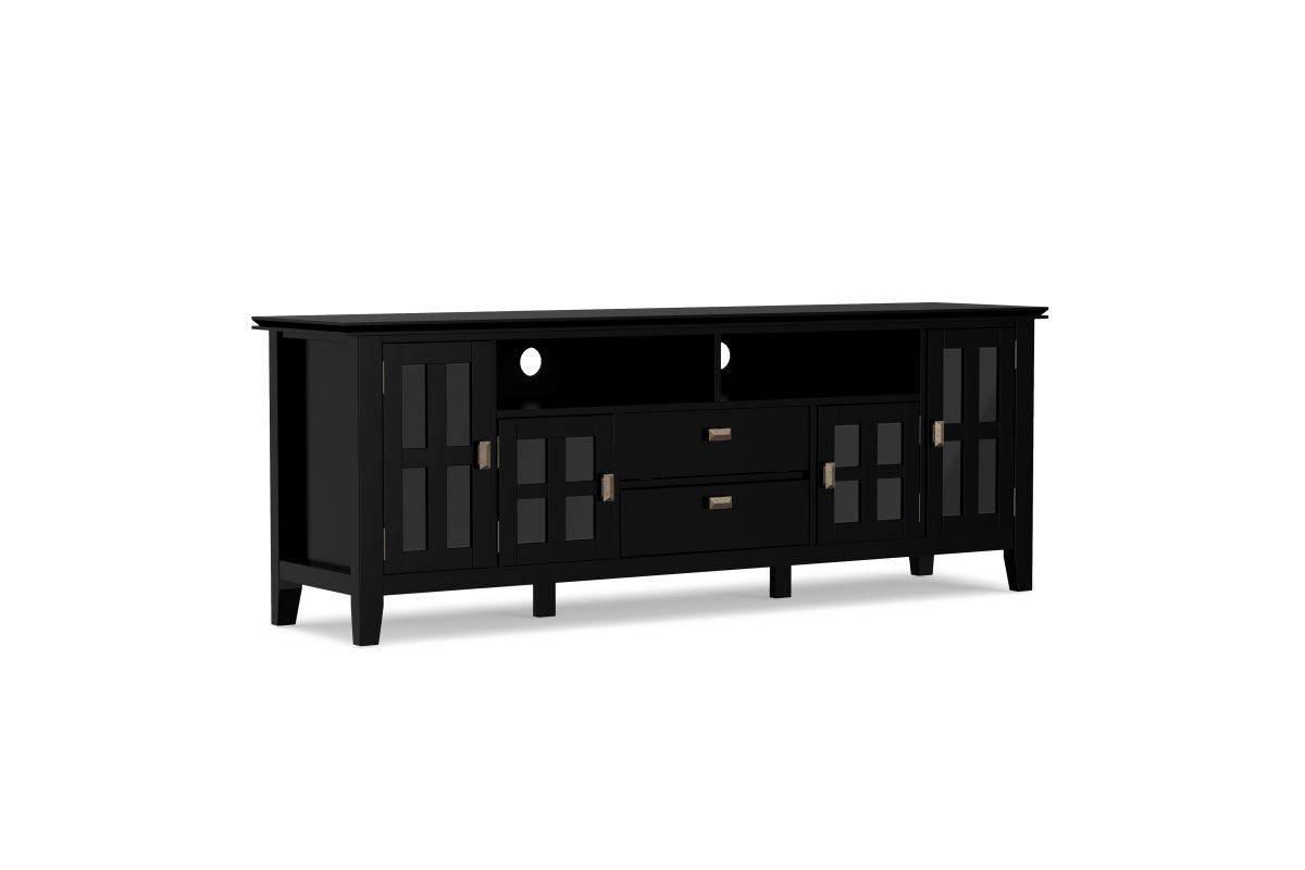 Now that 80 inch flat screen TVs are more affordable, you need to have one. To enjoy it fully, you will also need the perfect TV Stand to position your TV just right. Look no further. The Artisan Extra Wide TV Stand is perfectly sized for TVs up to 80 inches. It has plenty of storage space for all your media and gaming devices. It has a large centrally located open area with two drawers as well as two enclosed spaces. The two large side storage cabinets open to one adjustable shelf each. The unit features cord management cut-outs for easy installation of TV and media components. Assembly required.