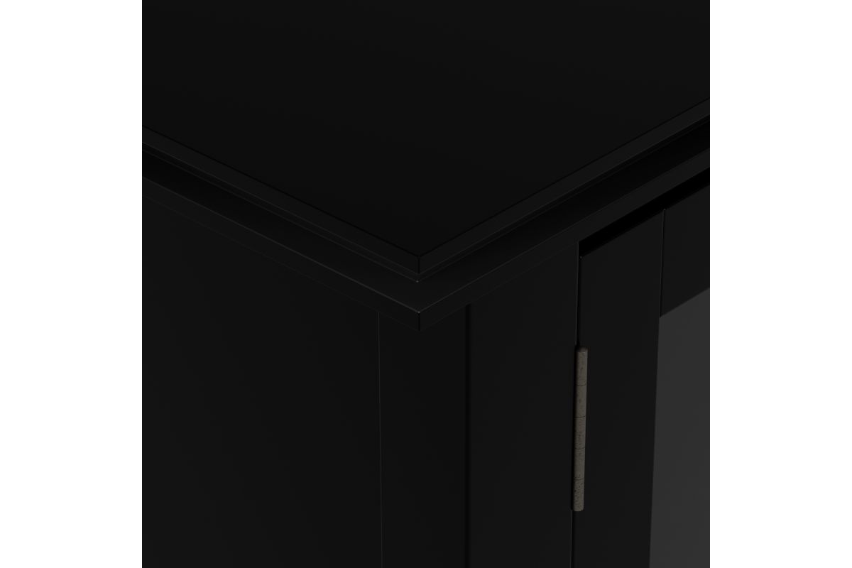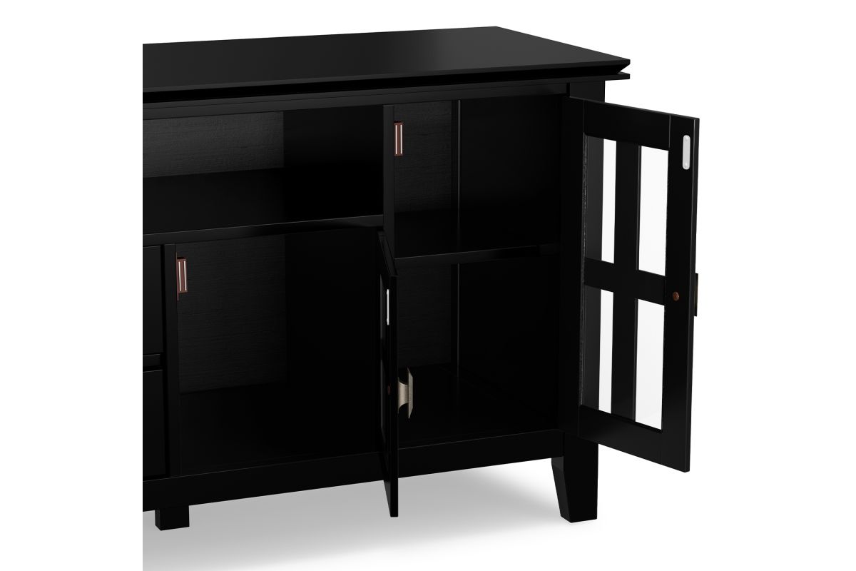 - Features a large centrally located open area with one (1) flip down drawer, one (1) pull out drawer as well as four (4) storage spaces with tempered glass doors.