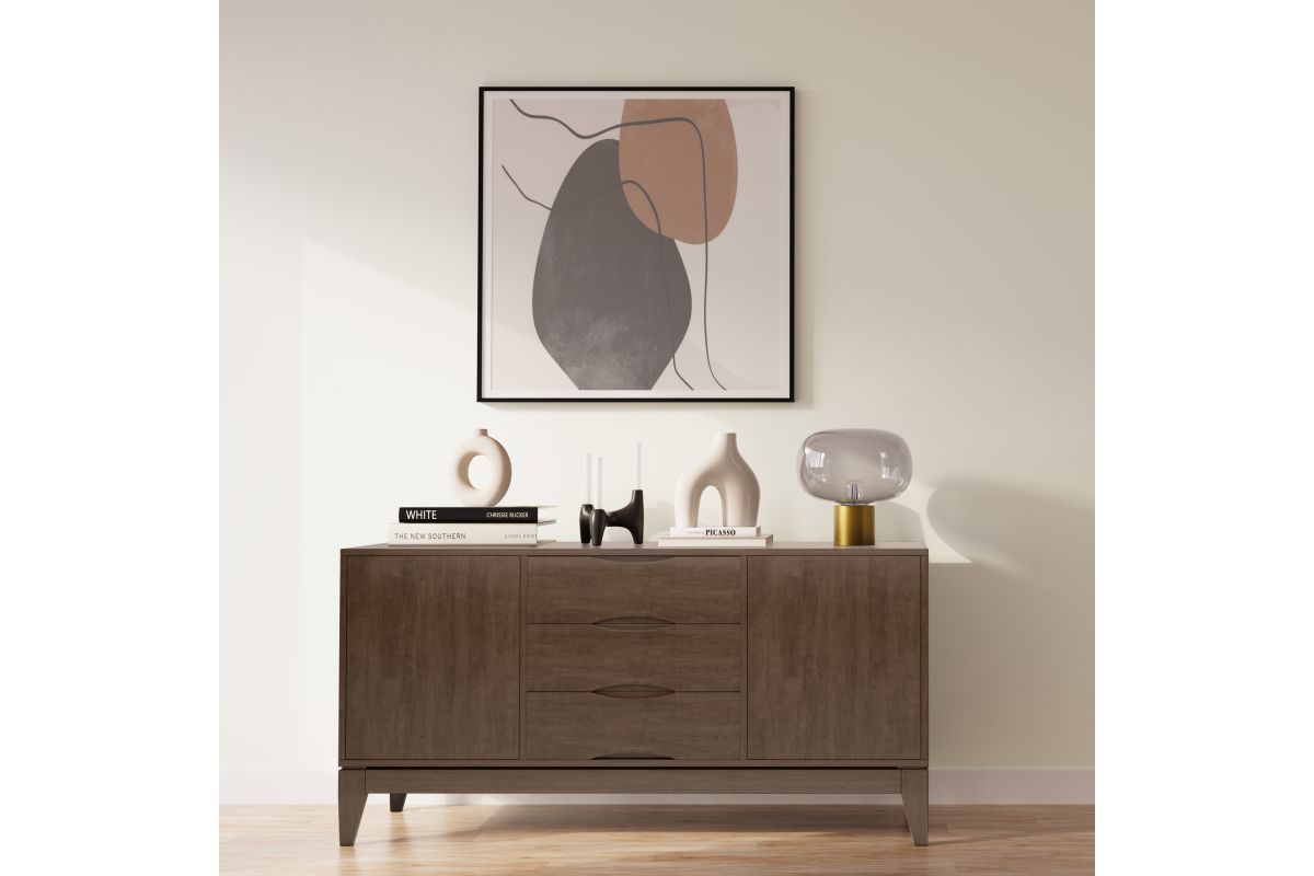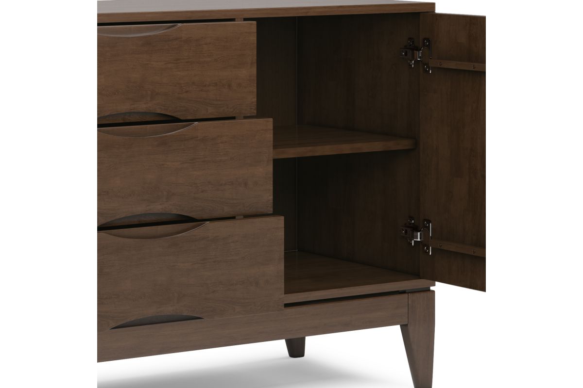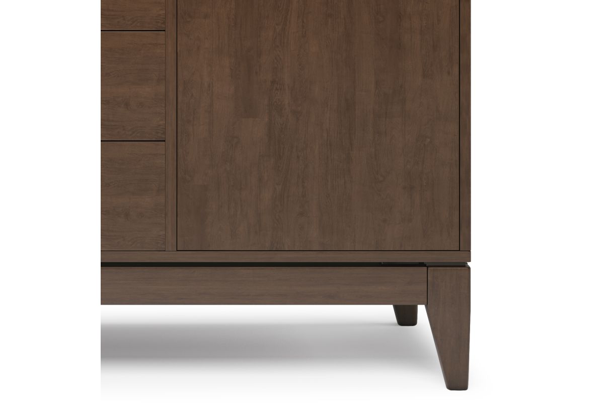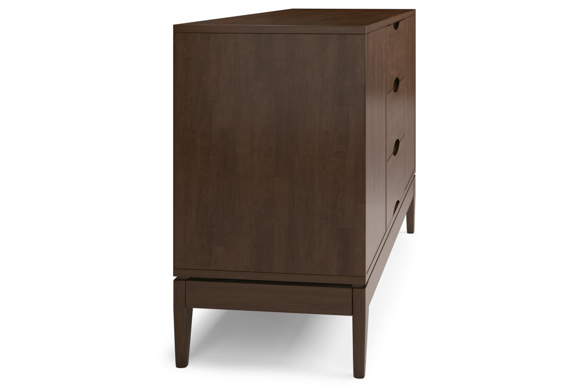 - Walnut Brown Finish: A rich walnut brown finish enhances the wood�s natural beauty; featuring clean lines, sculpted recessed handles, and tapered legs, this solid wood sideboard embodies mid-century modern elegance.