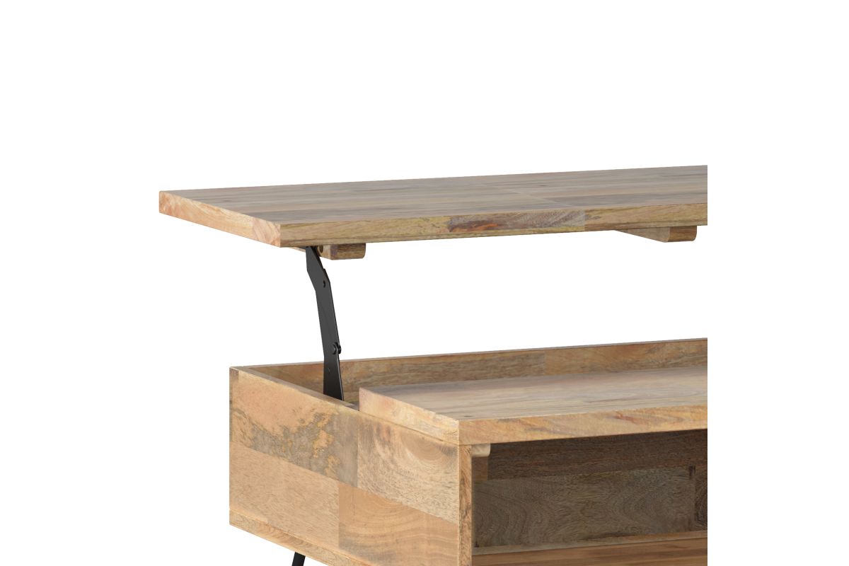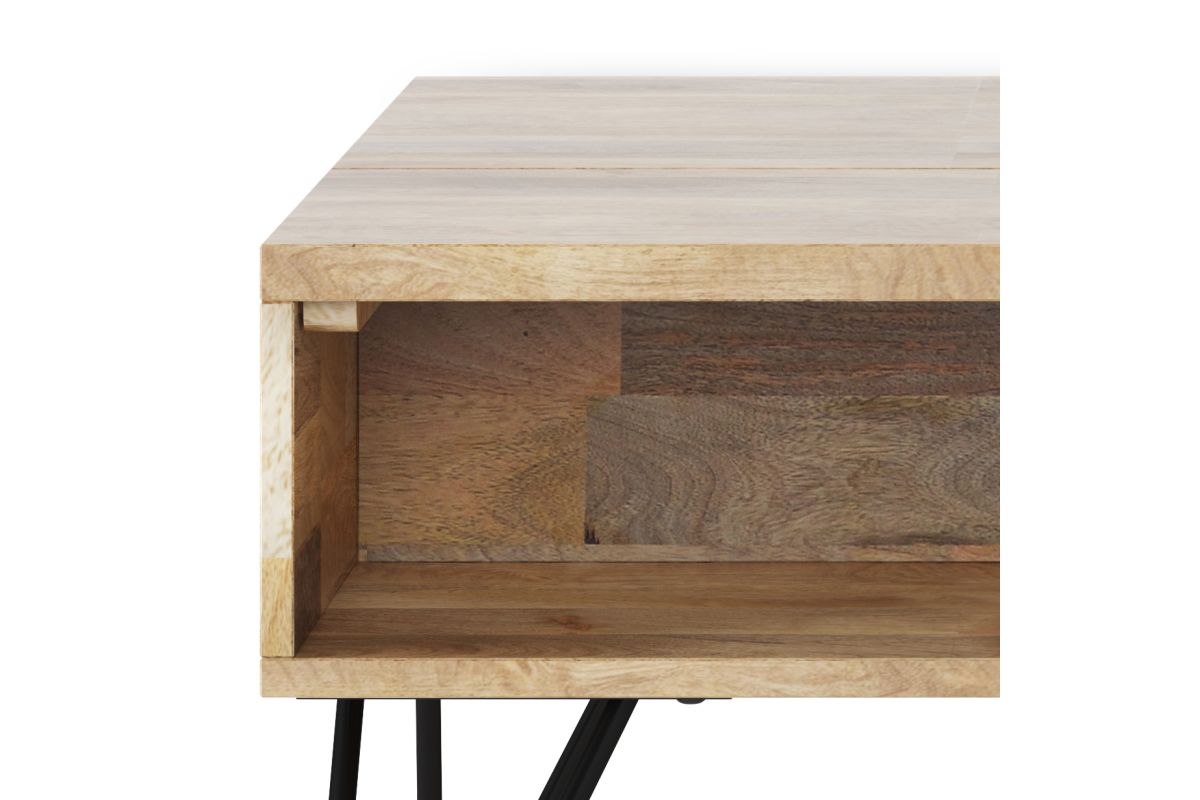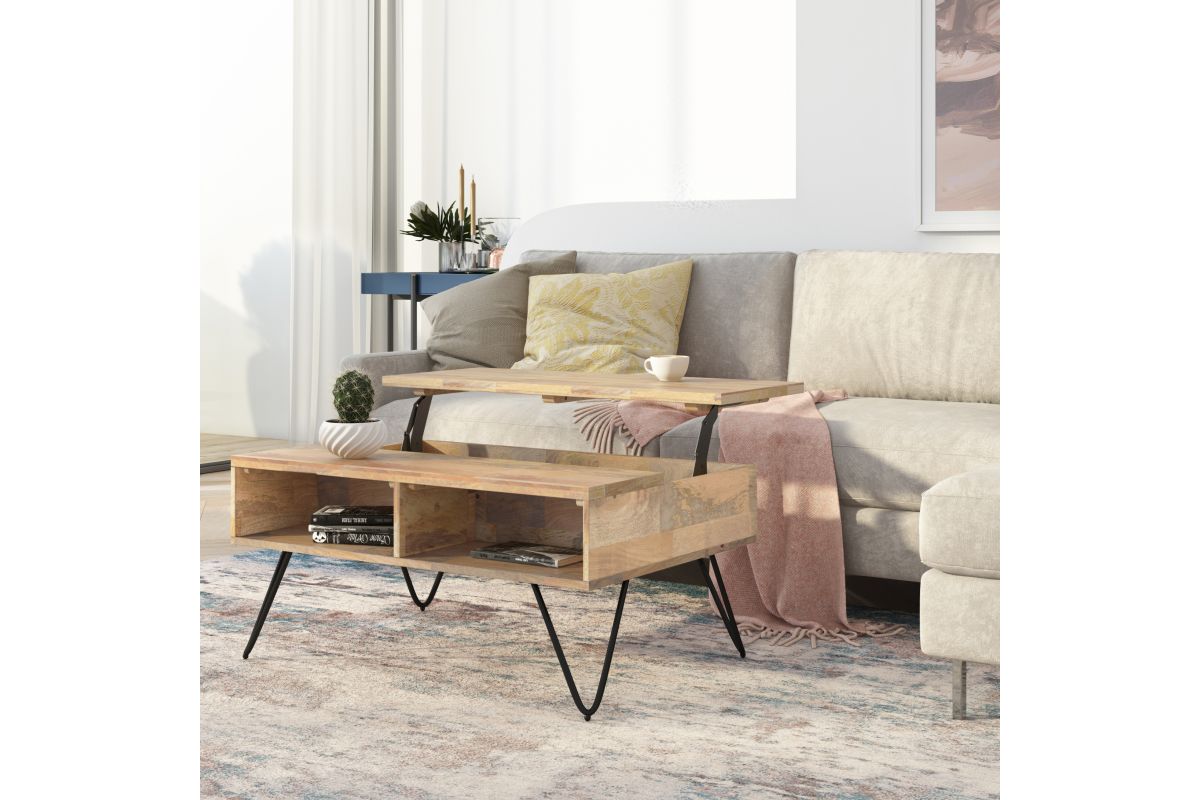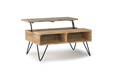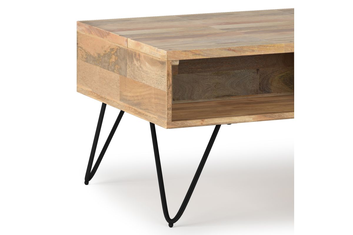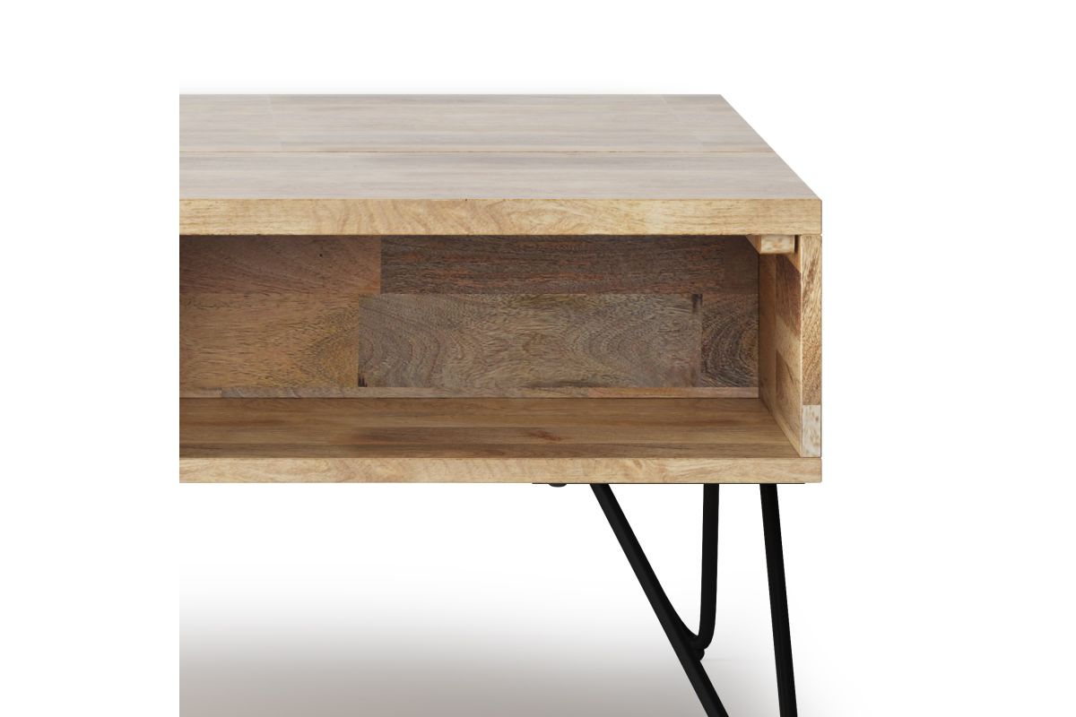 Style and convenience are at work in this uniquely functional Hunter Small Lift-Top Coffee Table. The top lifts up to reveal hidden storage, pulling toward you for the perfect surface to type on your laptop or eat in front of the television. The table features two open compartments for stacking books or displaying decorative objects. Hairpin legs along with Mango Wood add an industrial component. Assembly required.
