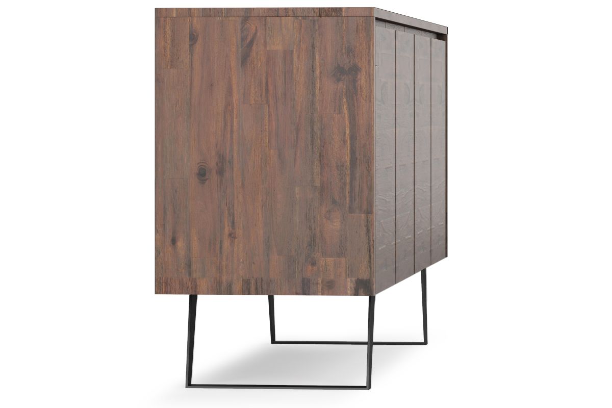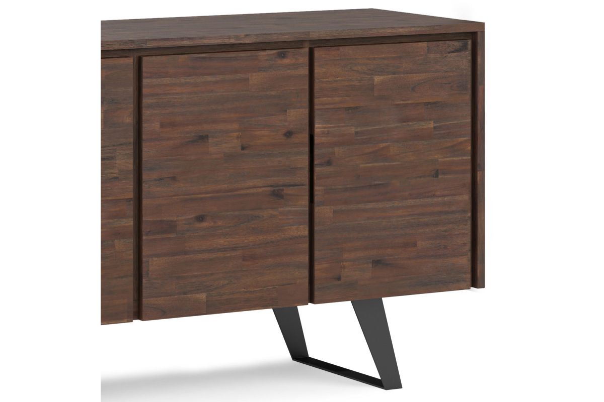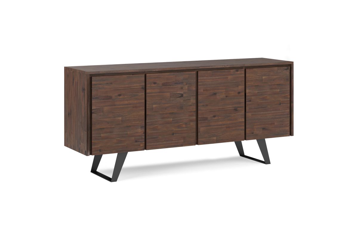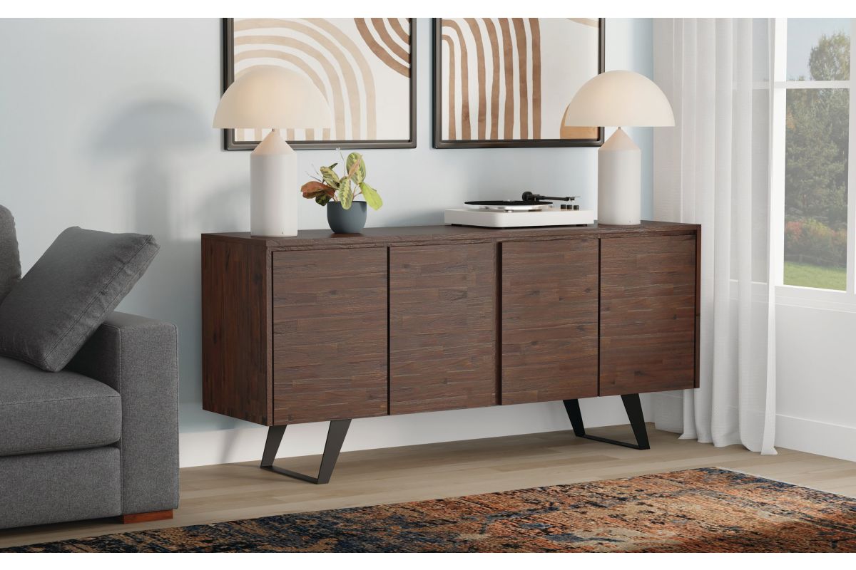 Elevate modern dining with the clean lines of the Modern Industrial Lowry Sideboard Buffet handcrafted from Solid Acacia Wood and Metal. The refined design provides generous storage behind four doors with hidden self-pulls, creating a streamlined look. Metal legs provide a mixed-material accent. Each door conceals an adjustable shelf. Assembly required.