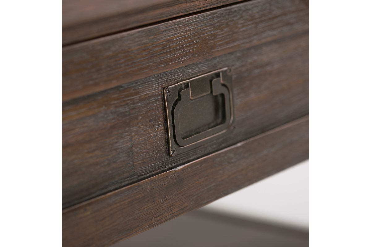 - Rustic design includes folding drawer pulls in an Antique Brass hardware finish