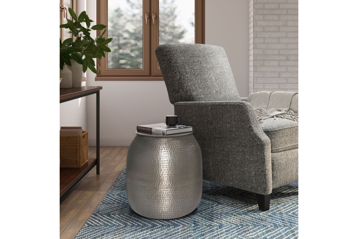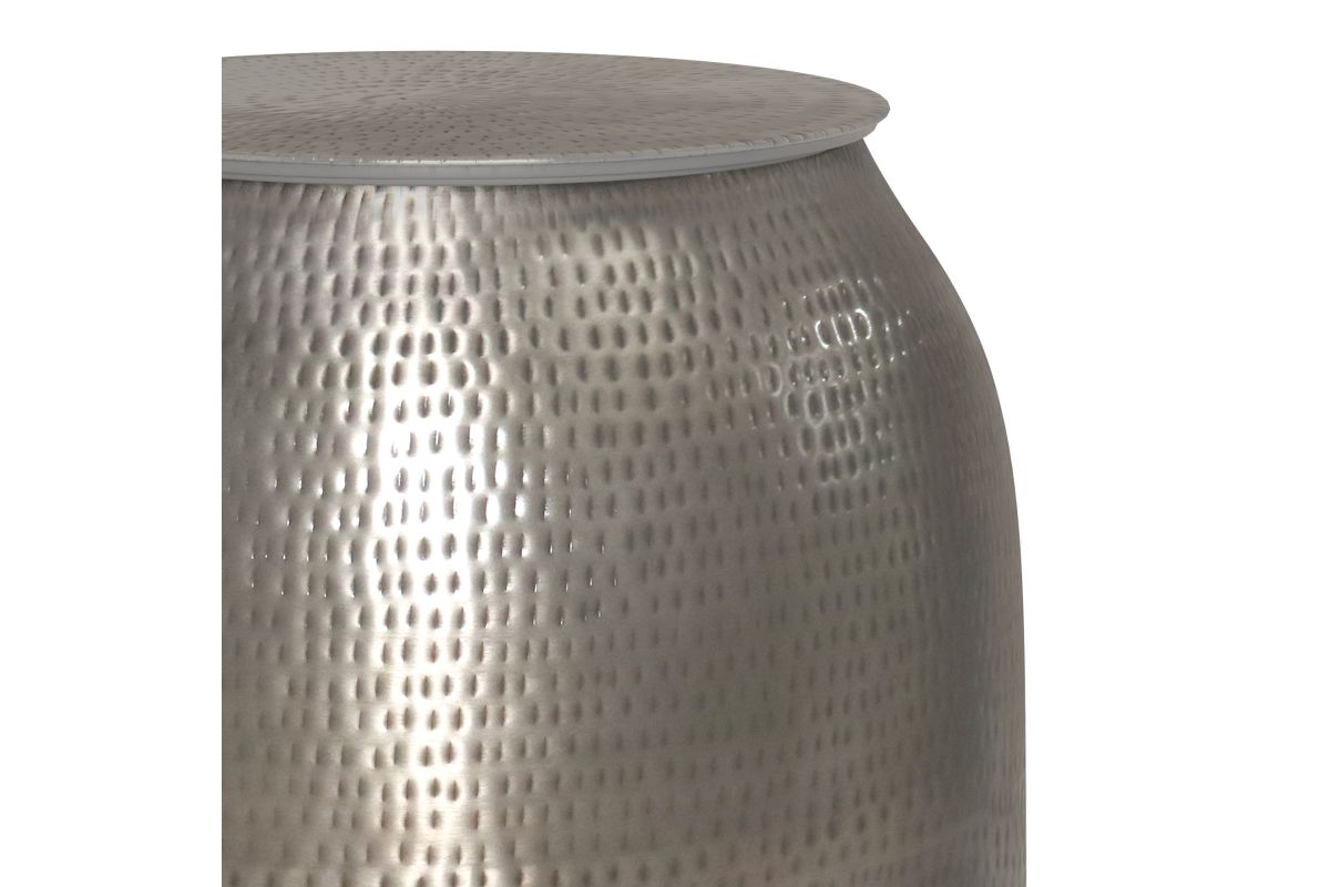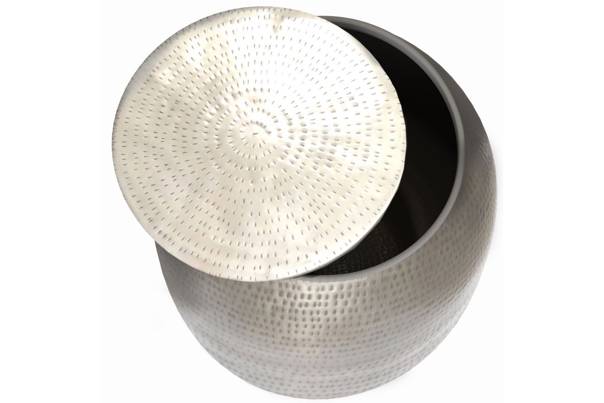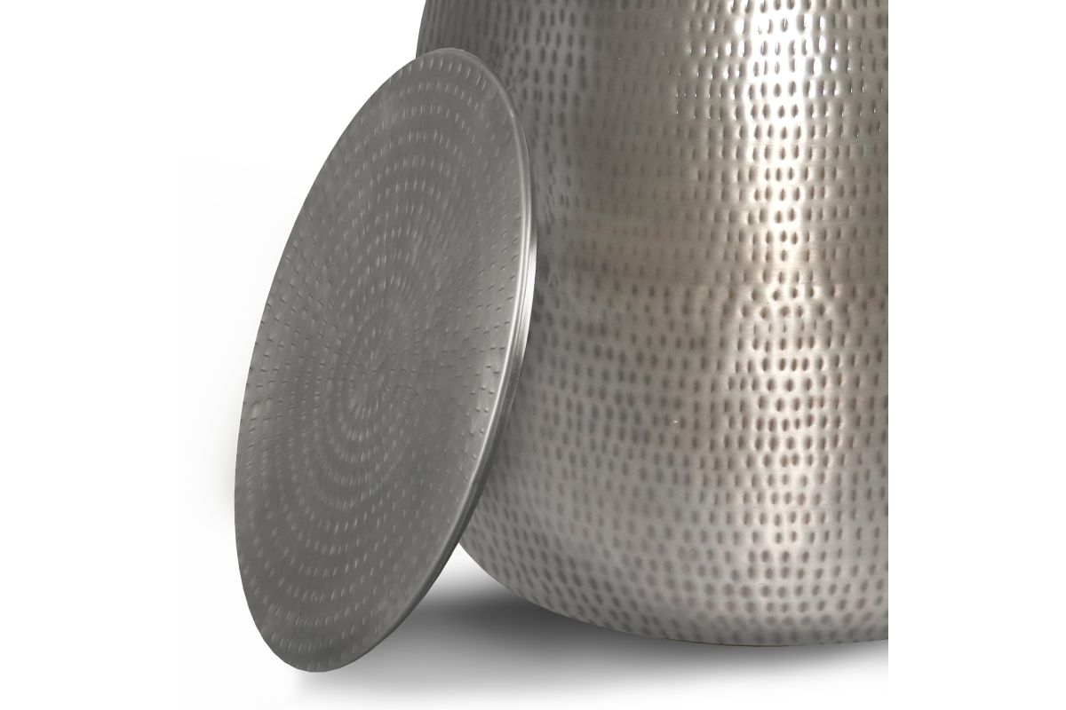 Hand-hammered detail and an antique silver finish give this Griffen Metal Storage Accent Table, its casual chic appeal. This piece is extremely versatile. For extra storage remove the top to store games, throws or extra pillows. This accent table is designed to add a glint of style to a living room or bedroom. No assembly required.