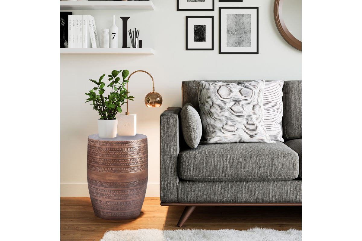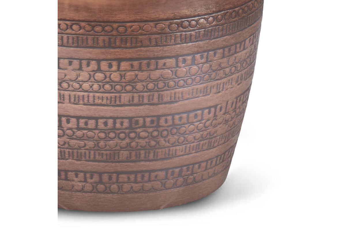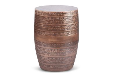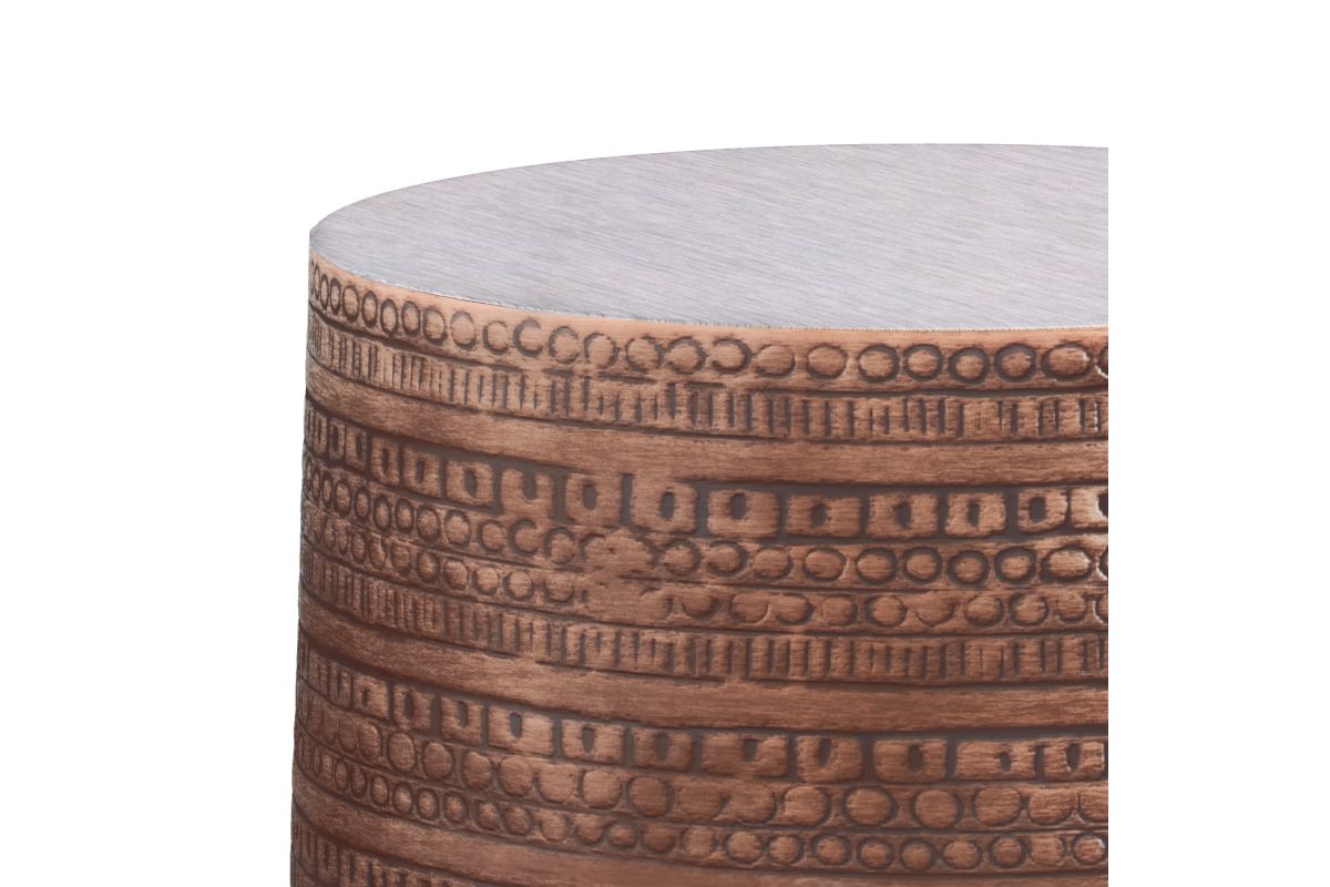 The Johnsen Tribal Pattern Metal Accent Table in Antique Copper brings rustic charm and sophisticated warmth to your home. Crafted from sturdy, powder-coated metal with a rich antique copper finish, this side table features a sleek drum design that blends seamlessly into industrial, transitional, or bohemian interiors. Lightweight yet durable, it's ideal as a decorative accent table, plant stand, or functional side table in living rooms, bedrooms, or commercial spaces. Its hand-applied copper finish adds depth and texture, making it a standout piece in any room. No assembly required.