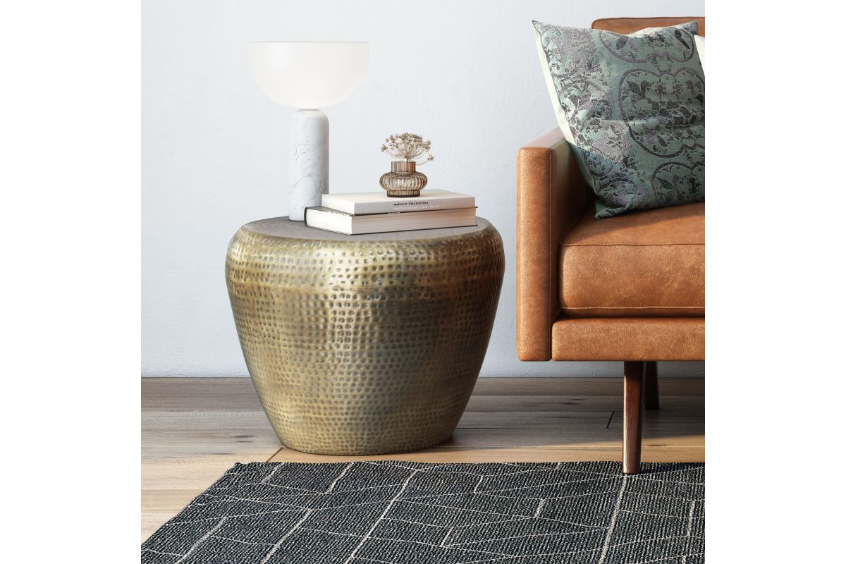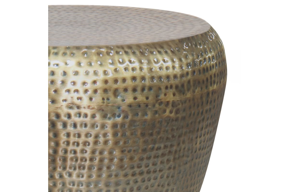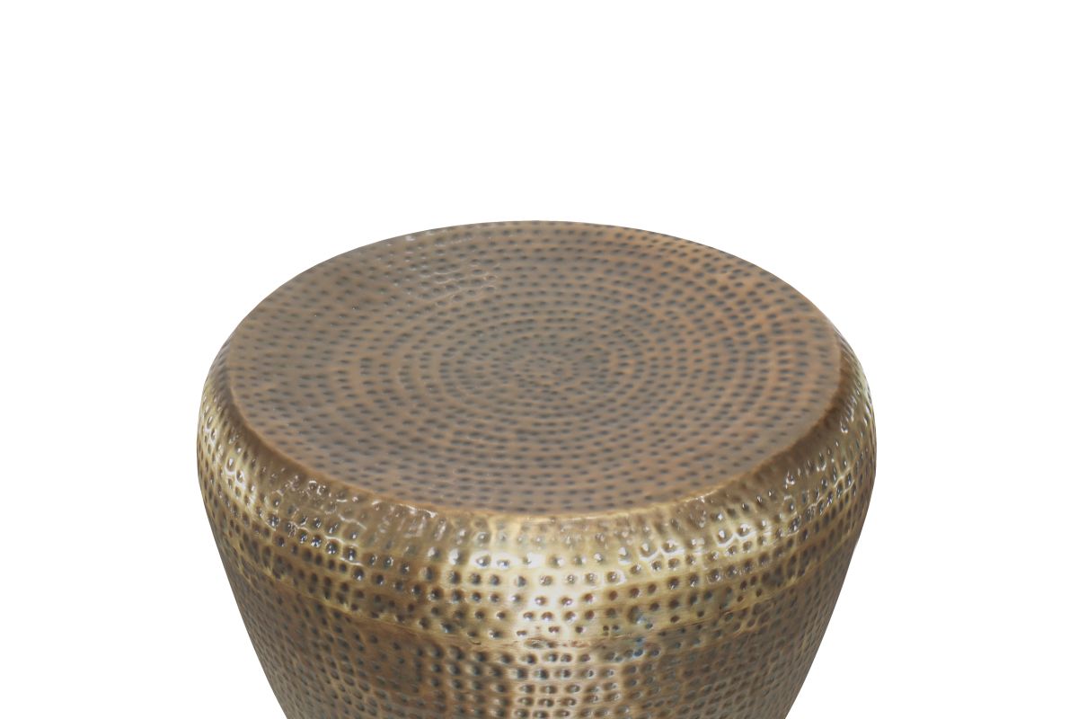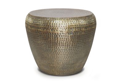Crafted from metal, the Preston Accent Table drum shaped side table features a hand hammered textured finish pattern across the body and on the tabletop. The stunning antique finish gives this side table an alluring look. Display it next to a sofa, chair, or bed. A truly gorgeous piece of home furnishing that will not disappoint. No assembly required.