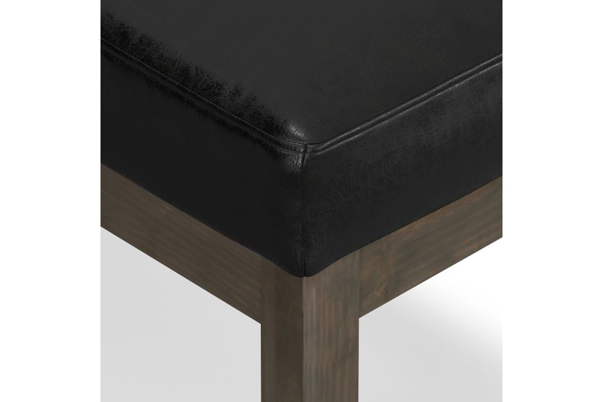 - Upholstered with a durable Distressed Black Vegan Faux Leather
