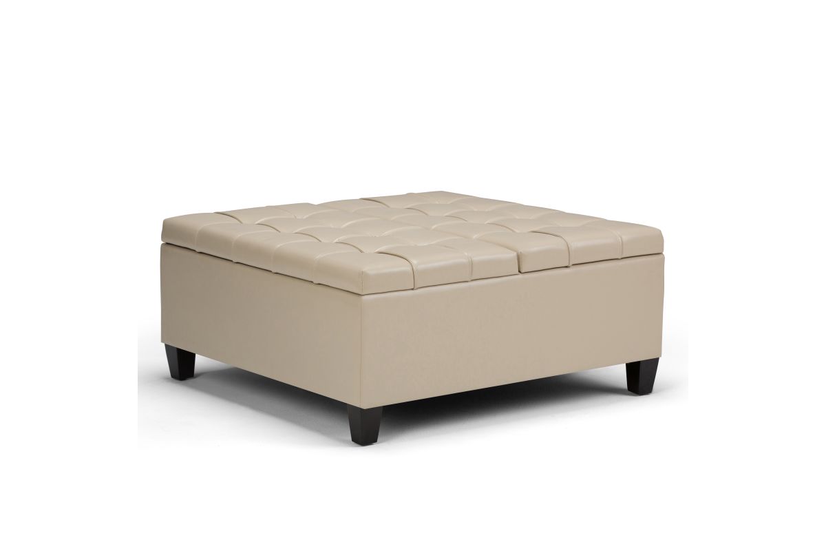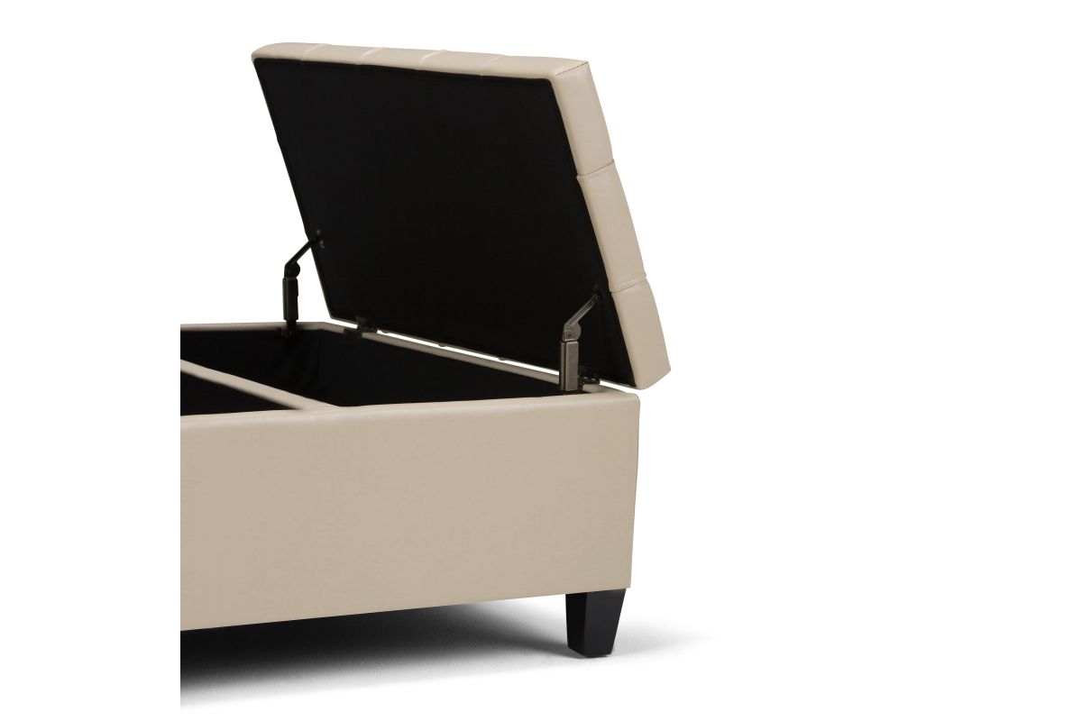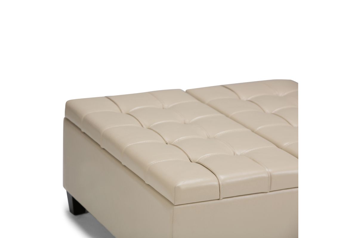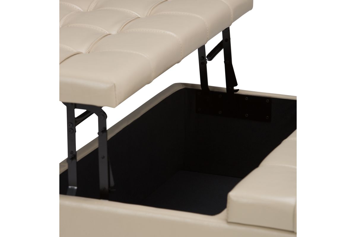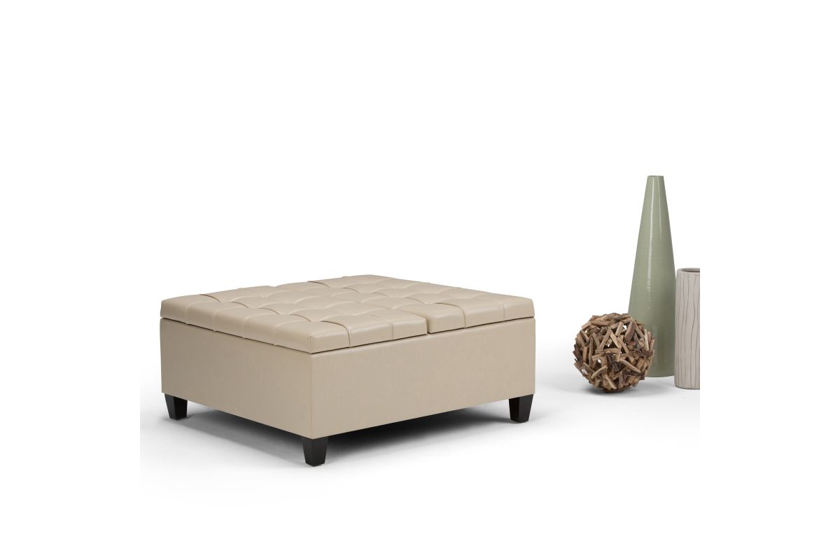 Maximize the space in your living room or family room with the Harrison Coffee Table Storage Ottoman. The contemporary, yet functional design of the ottoman makes it a necessity for any home. The split top features stylish tufted details and one side lifts up - perfect for a lap top, tablet or dining. The large interior space is the perfect solution for your storage needs. The Harrison Coffee Table Storage Ottoman is available in a variety of colors and upholstered options. Assembly required.