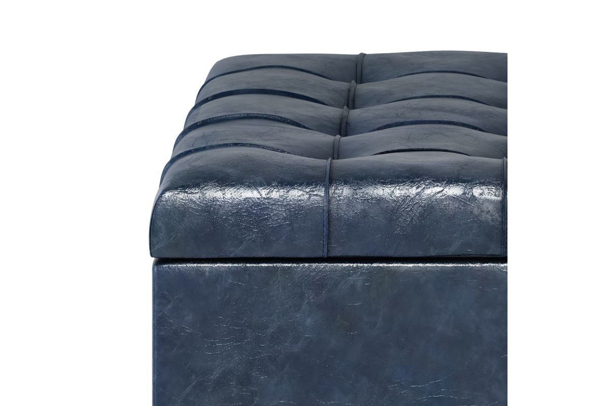 - Upholstered with a durable Denim Blue Vegan Faux Leather