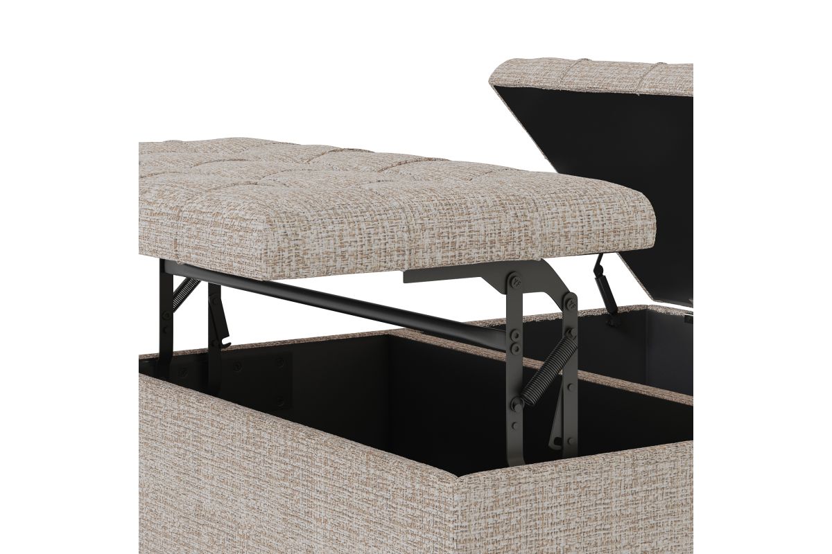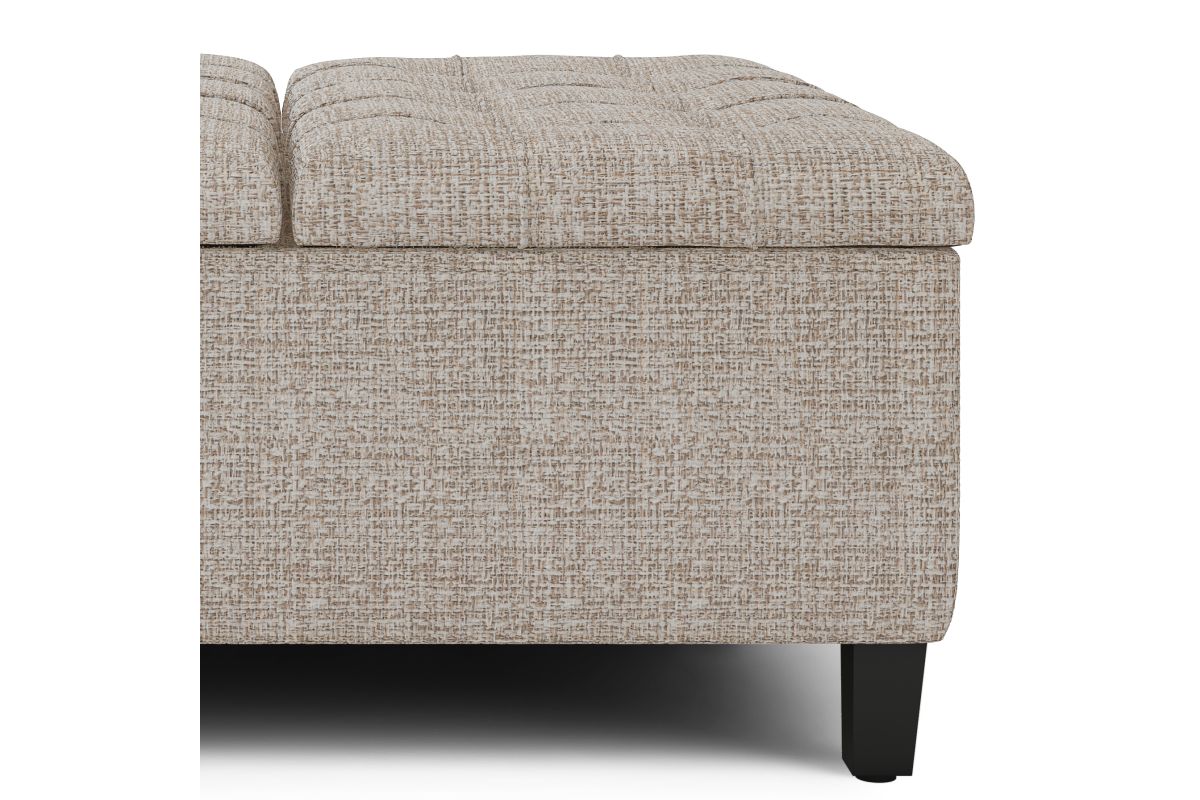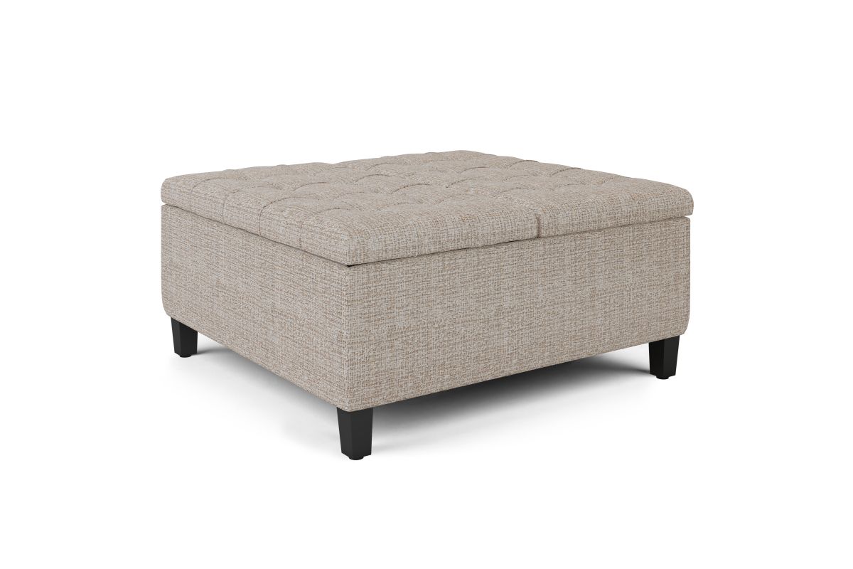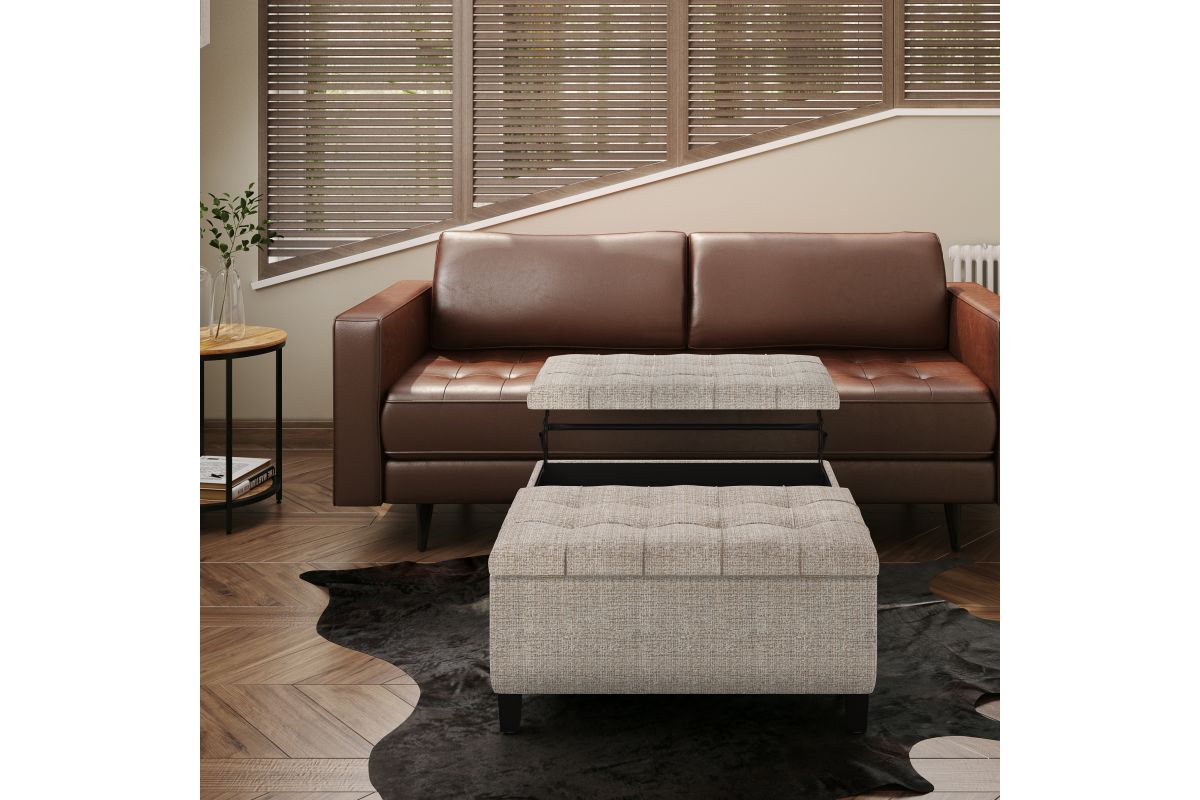 Maximize the space in your living room or family room with the Harrison Coffee Table Storage Ottoman. The contemporary, yet functional design of the ottoman makes it a necessity for any home. The split top features stylish tufted details and one side lifts up - perfect for a lap top, tablet or dining. The large interior space is the perfect solution for your storage needs. The Harrison Coffee Table Storage Ottoman is available in a variety of colors and upholstered options. Assembly required.