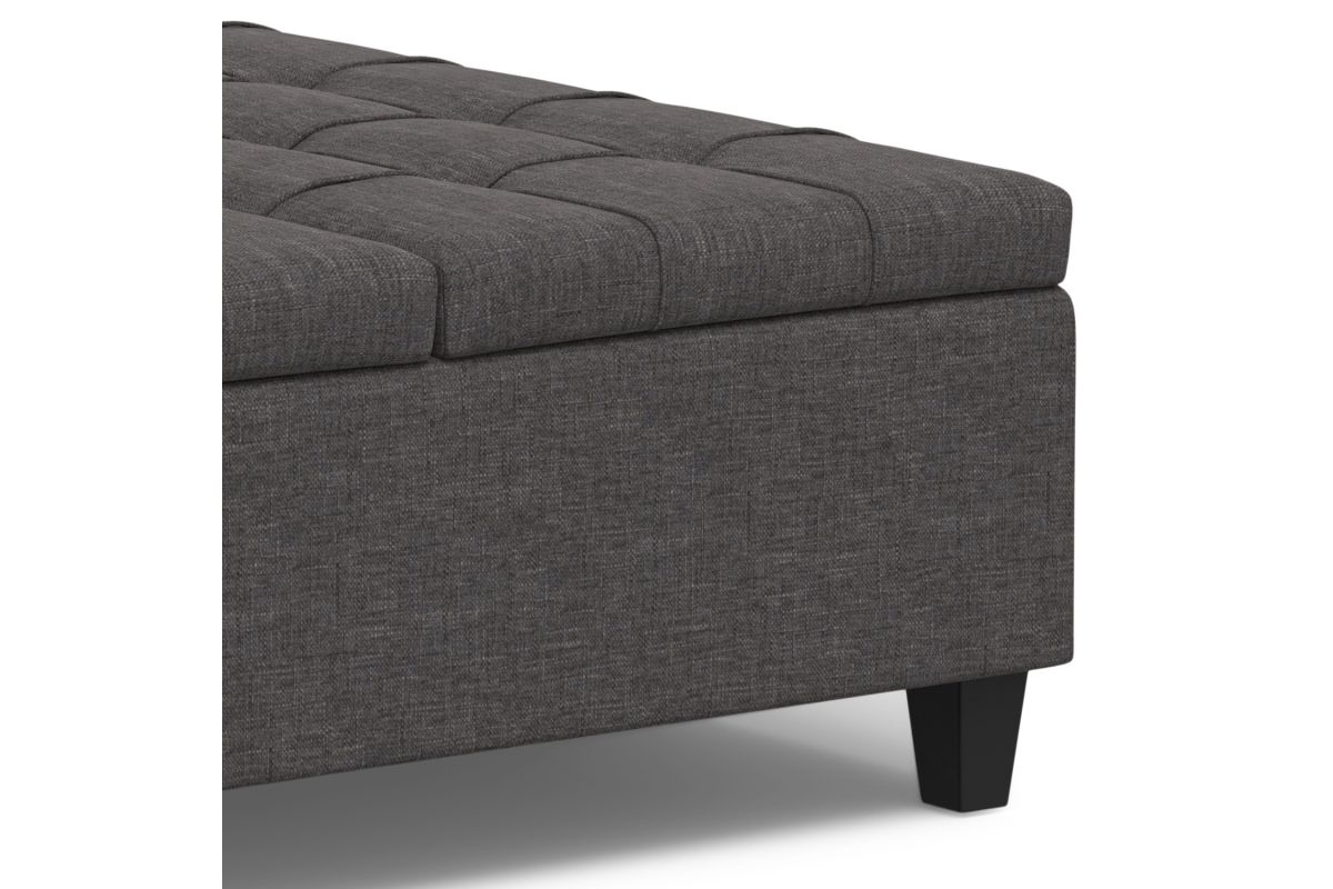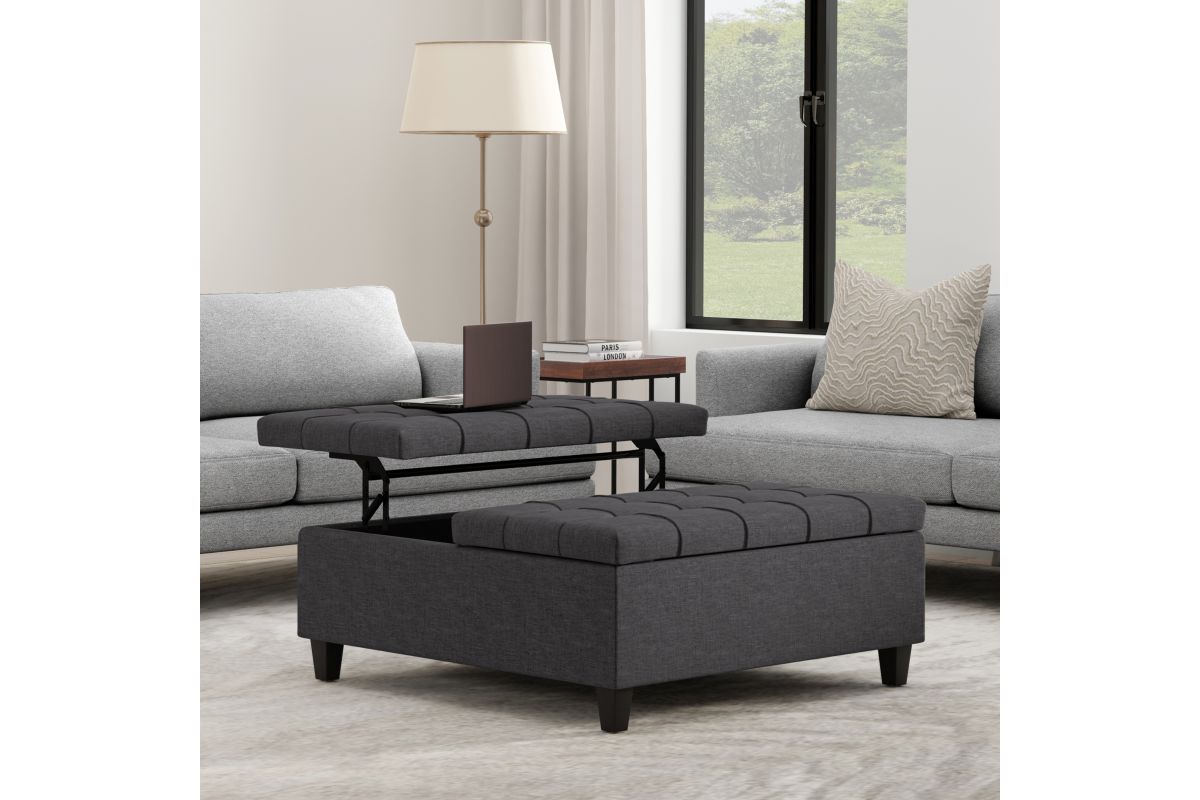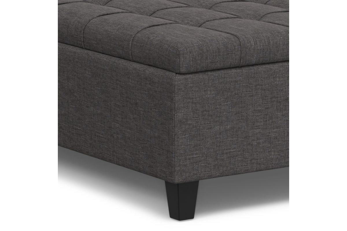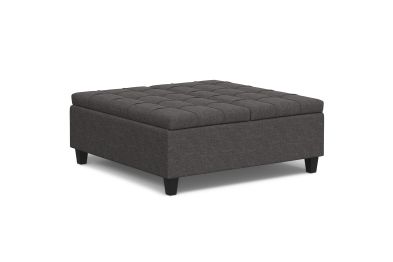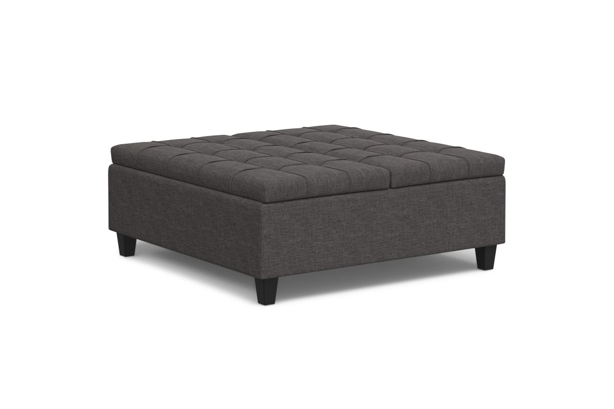Maximize the space in your living room or family room with the Harrison Large Square Coffee Table Storage Ottoman. The contemporary, yet functional design of the ottoman makes it a necessity for any home. The split top features stylish tufted details and one side lifts up - perfect for a laptop, tablet, or dining. The large interior space is the perfect solution for your storage needs. The Harrison Large Square Coffee Table Storage Ottoman is available in a variety of colors and upholstered options. Assembly required.