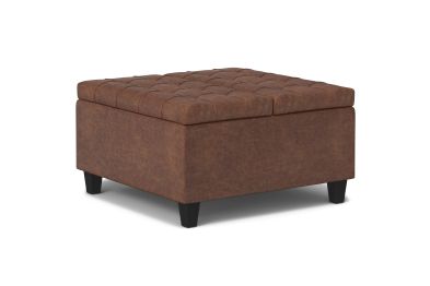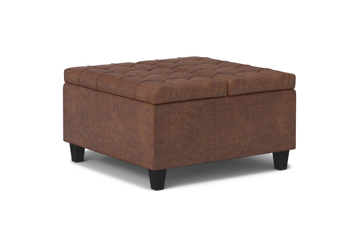 Maximize the space in your living room or family room with the Harrison Small Square Coffee Table Storage Ottoman. The contemporary, yet functional design of the ottoman makes it a necessity for any home. The split top features stylish tufted details and one side lifts up - perfect for a laptop, tablet, or dining. The large interior space is the perfect solution for your storage needs. The Harrison Small Square Coffee Table Storage Ottoman is available in a variety of colors and upholstered options. Assembly required.