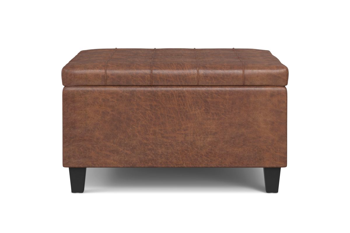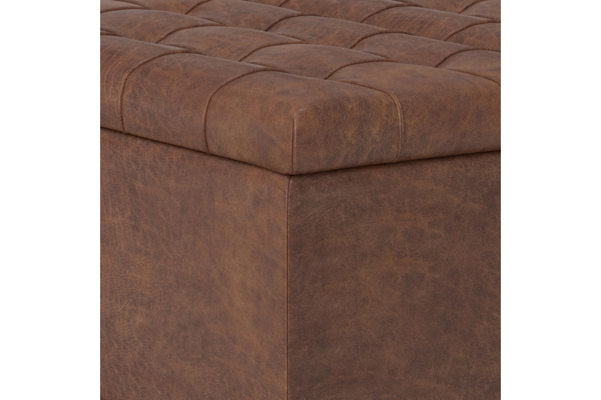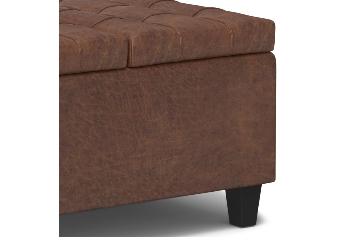 - Upholstered with a durable Distressed Saddle Brown Vegan Faux Leather