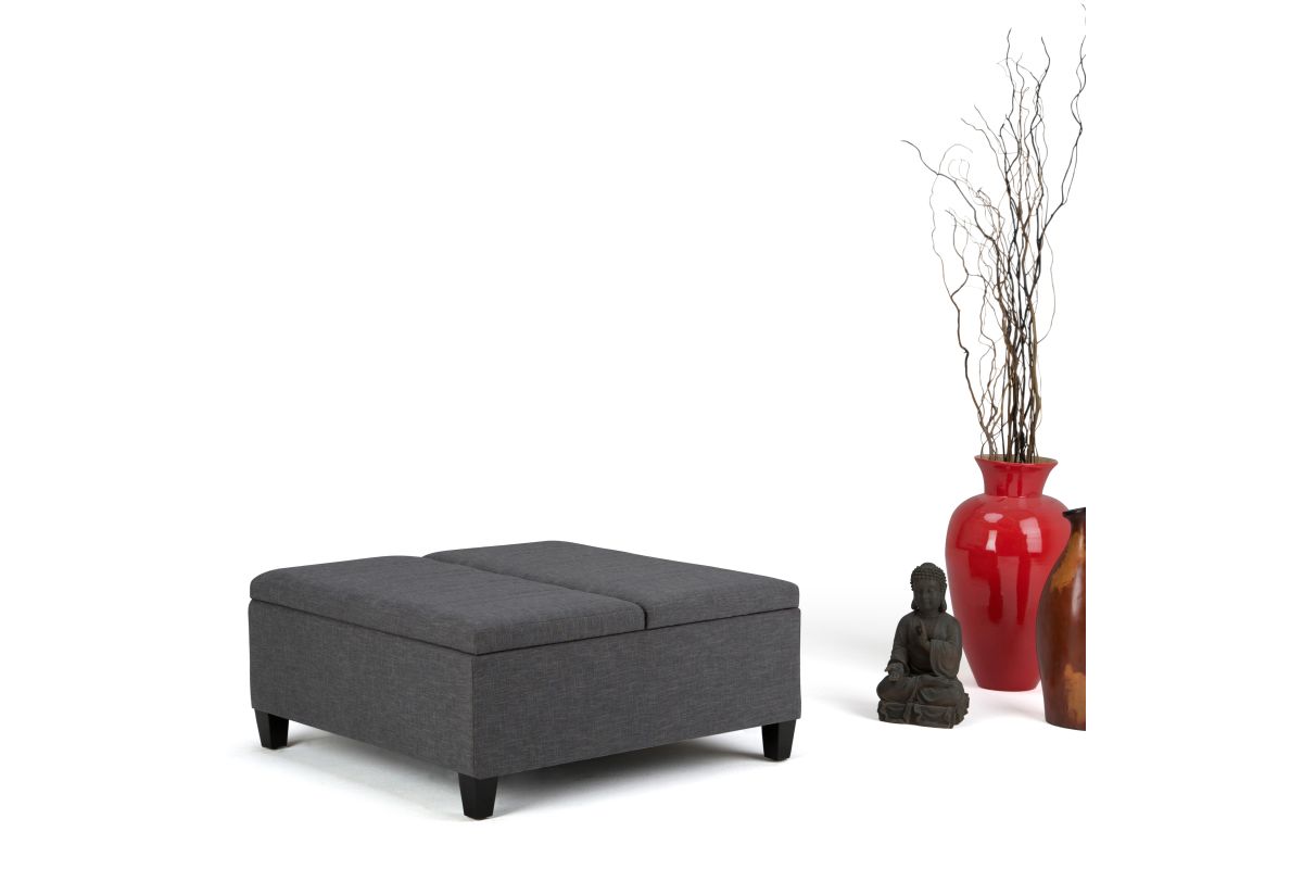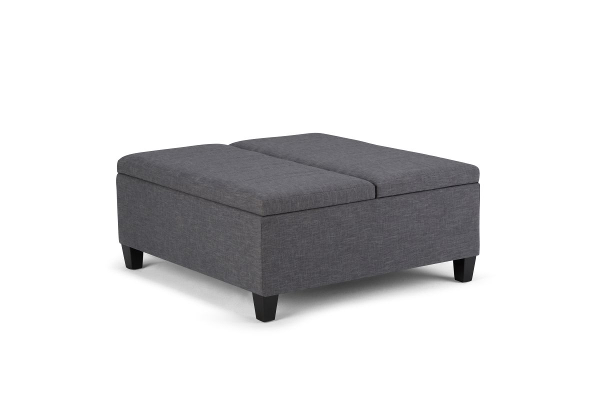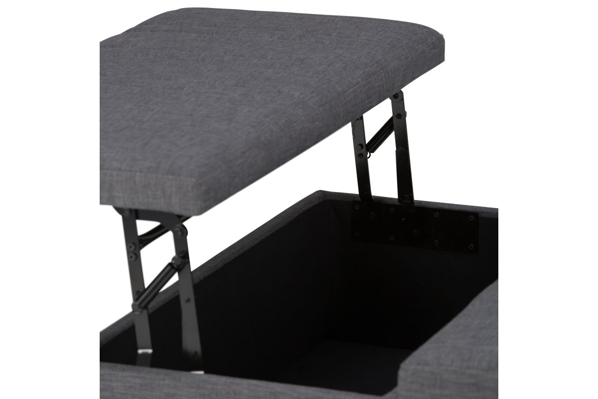 Maximize the space in your living room or family room with the Ellis Coffee Table Storage Ottoman. The contemporary, yet functional design of the ottoman makes it a necessity for any home. The split top features modern stylish stitching details and one side lifts up - perfect for a lap top, tablet or dining. The large interior space is the perfect solution for your storage needs. The Ellis Coffee Table Storage Ottoman is available in a variety of colors and upholstered options. Assembly required.
