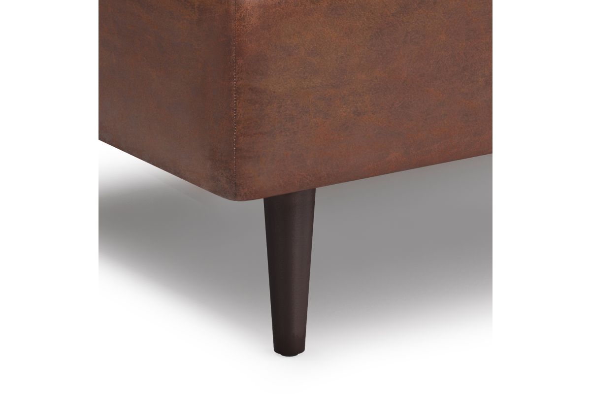 - Upholstered with a durable Distressed Saddle Brown Vegan Faux Leather