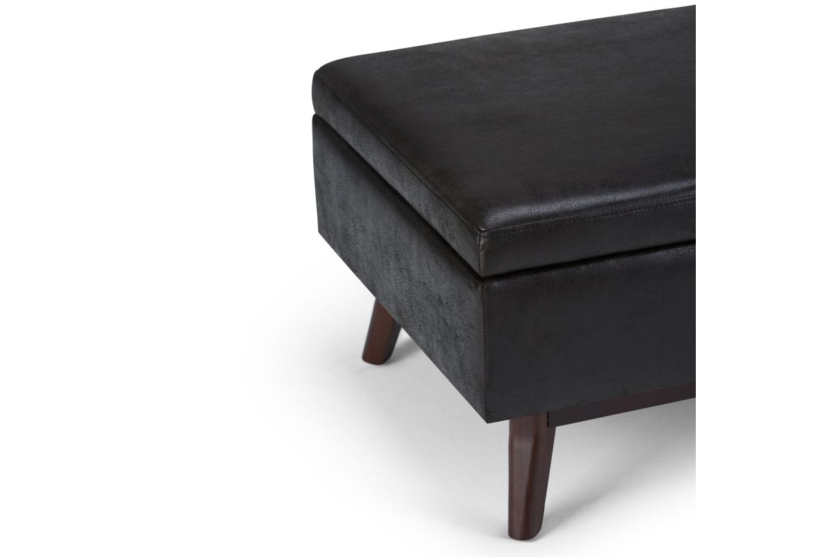 - Upholstered with a durable Distressed Black Vegan Faux Leather