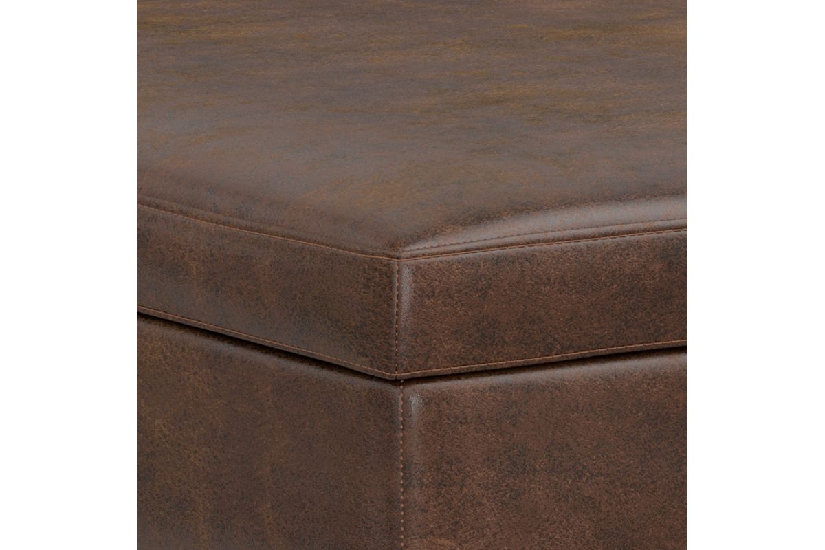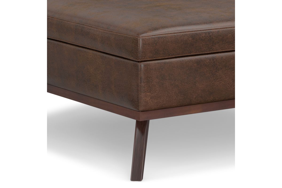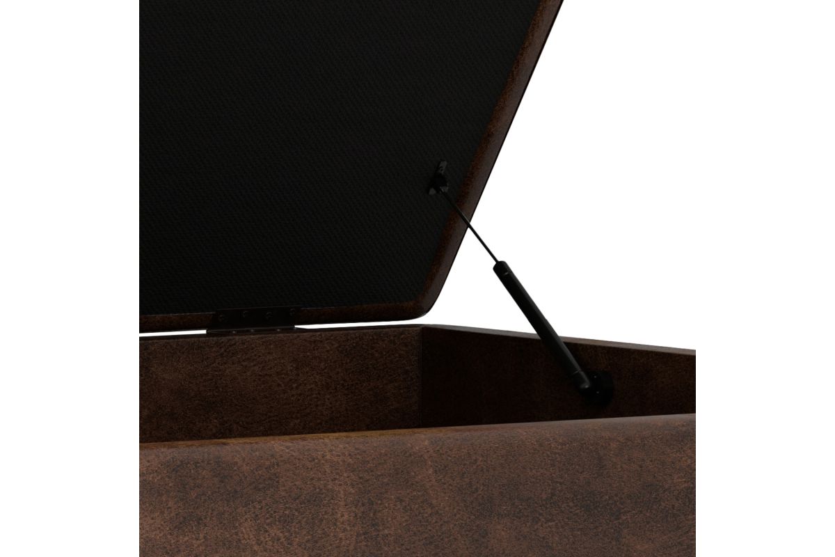 - Upholstered with a durable Distressed Chestnut Brown Vegan Faux Leather